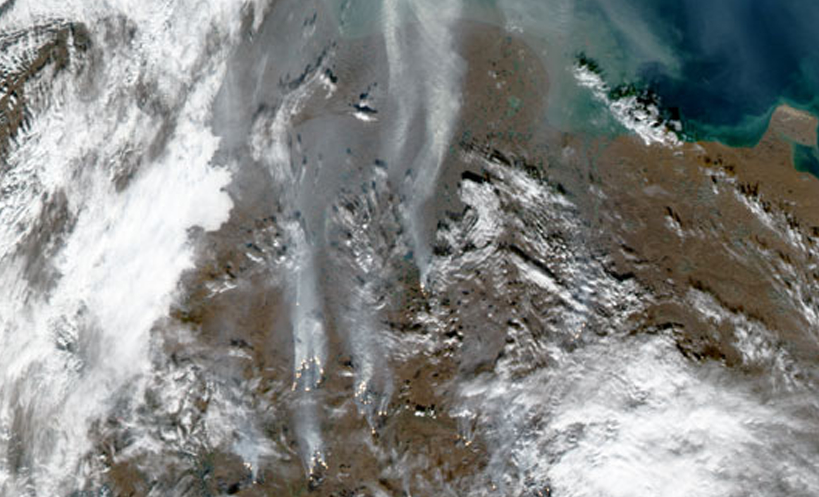 Late Summer Fires in Siberia. Several large fires in northeastern Russia are billowing massive smoke clouds over the East Siberia Sea. This Aqua MODIS image shows the region on September 16, 2003. Active fire detections made by the sensor are highlighted in yellow in the bottom center of the image. In Siberia, the soil is made of thick layers of peat—dead organic material that is slow to decay in the frigid temperatures. When this material catches fire, it produces huge amounts of smoke.