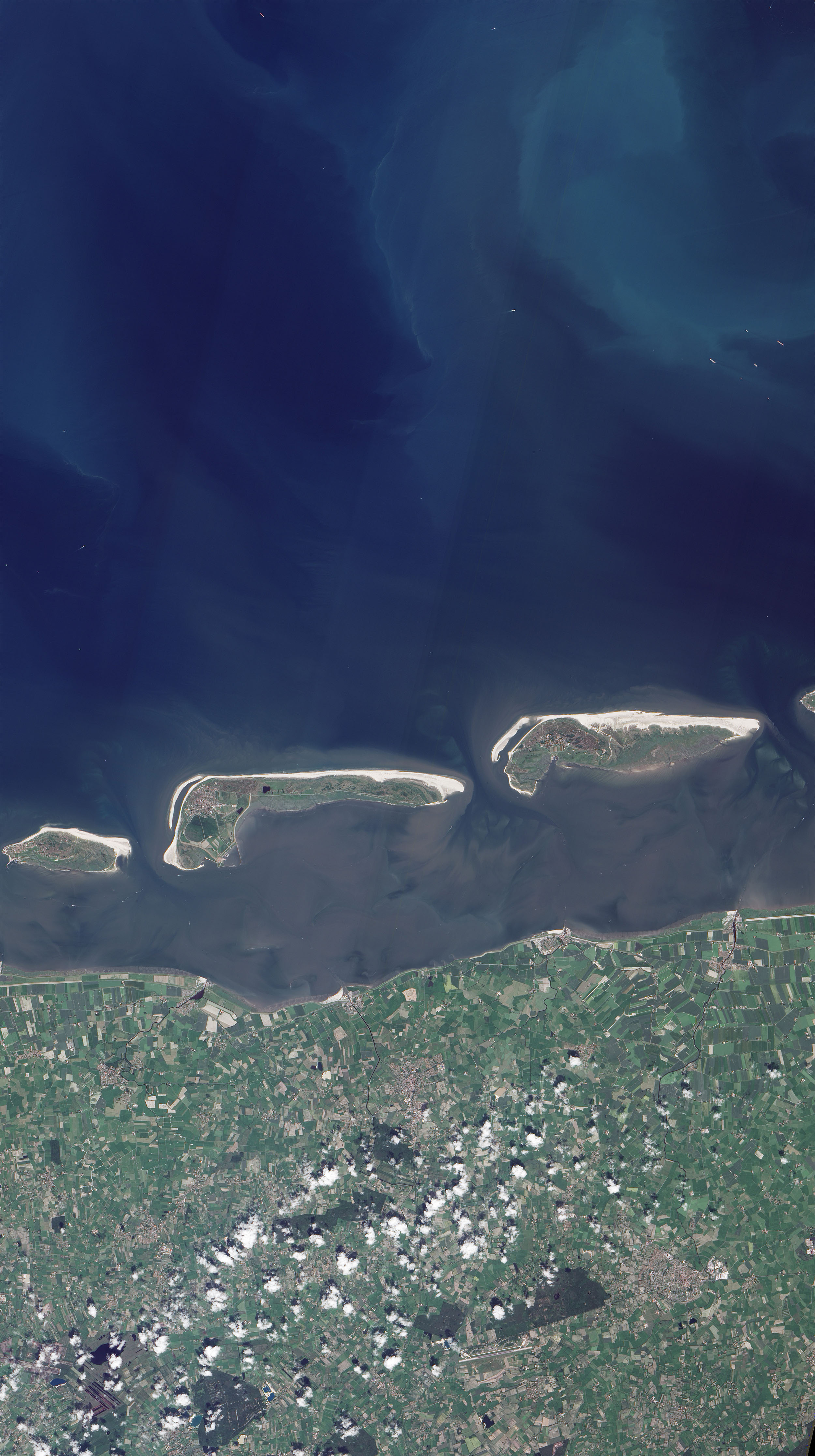 Lenses of Fresh Water Under Langeoog. Langeoog is one of several sandy barrier islands along Germany’s North Sea coast. The island, about 8 kilometers (5 miles) north of the German mainland, formed about 2,800 to 2,200 years ago. Dunes began to develop about 1,900 years ago, but the island was mainly sand until soils formed and vegetation arrived about 1,200 years ago.