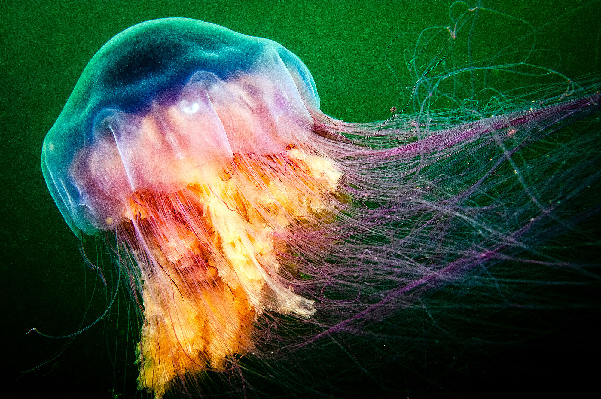 Lion’s mane jellyfish are named for their showy, trailing tentacles reminiscent of a lion’s mane. Lion’s mane jellyfish remain mostly very near the surface, at no more than 20 m (66 ft) depth.
