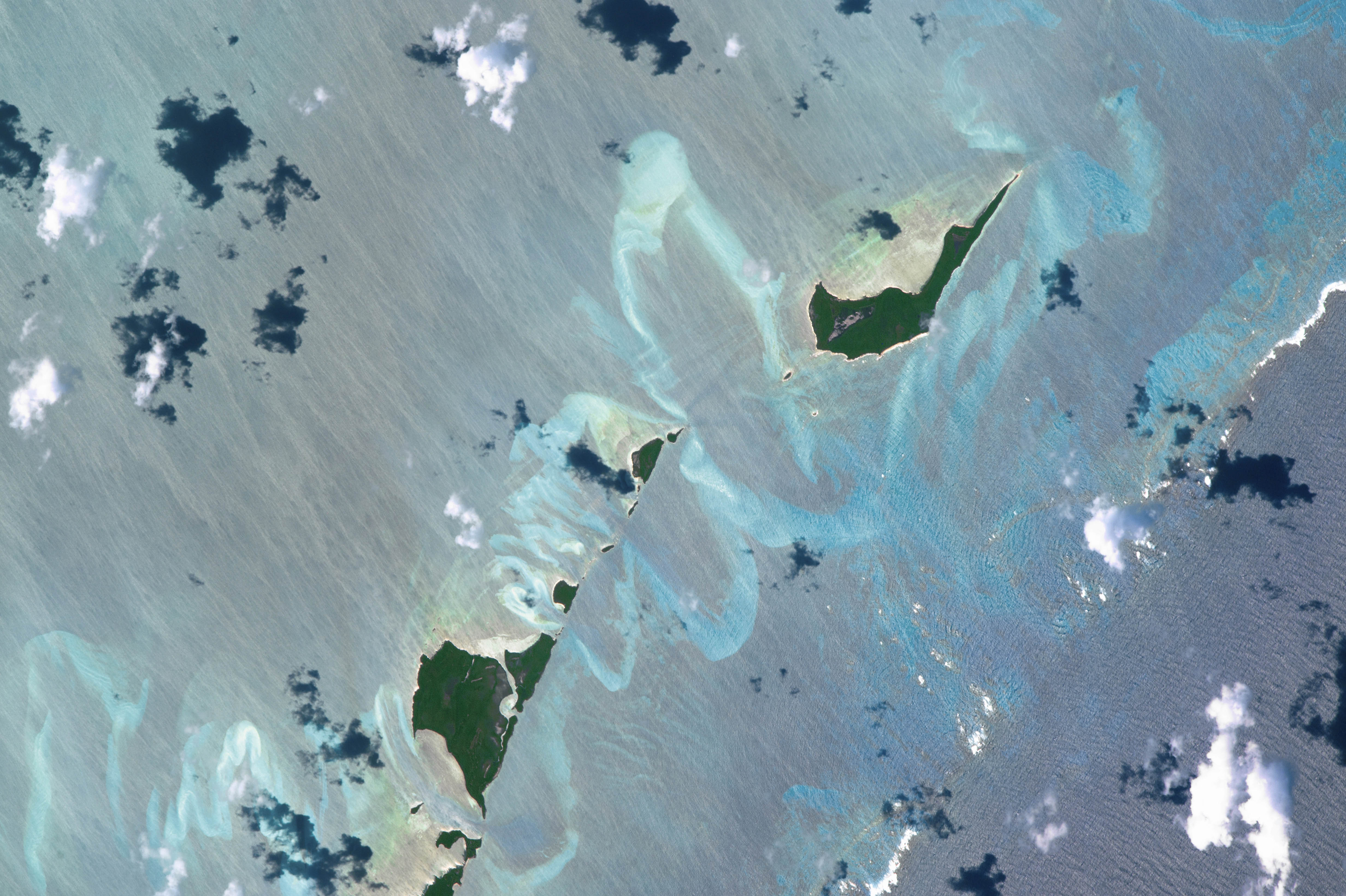 The small island known as Strangers Cay is 3.6 kilometers (2.25 miles) long, giving some perspective on the vast stretches of seafloor affected by the tides on this shallow bank. Other black shapes are the shadows of clouds.