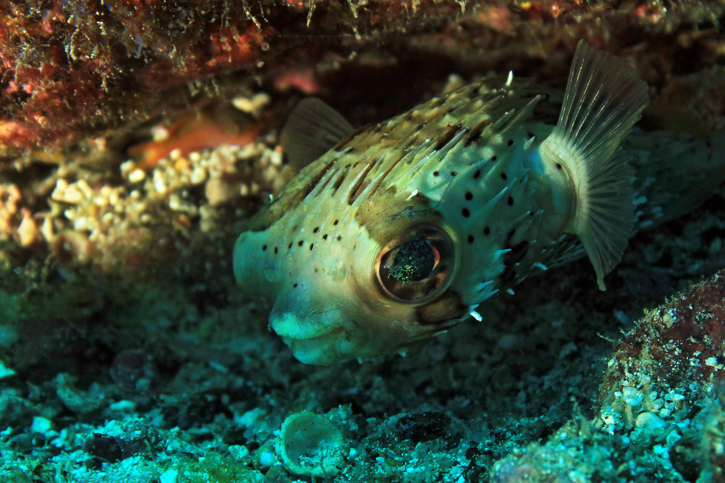 The long-spine porcupinefish is pale in color with large black blotches and smaller black spots; these spots becoming fewer in number with age. It has many long, two-rooted depressible spines particularly on its head. The teeth of the two jaws are fused into a parrot-like “beak”.