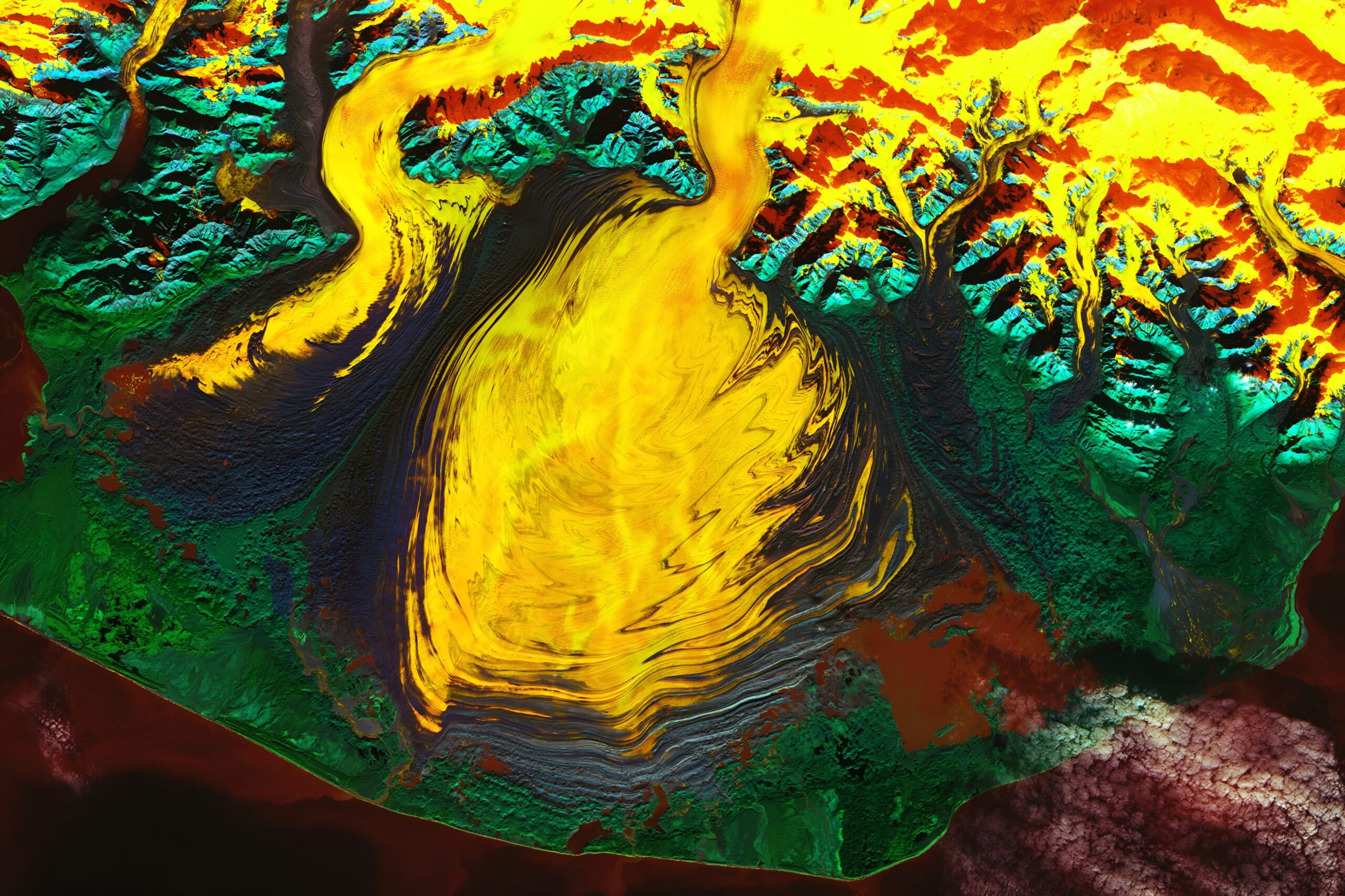 “To human eyes, glacial ice typically looks white tinged with blue. But in this false-color satellite image, the rippled ice of Alaska’s Malaspina Glacier appears more fiery than frosty,” said NASA.