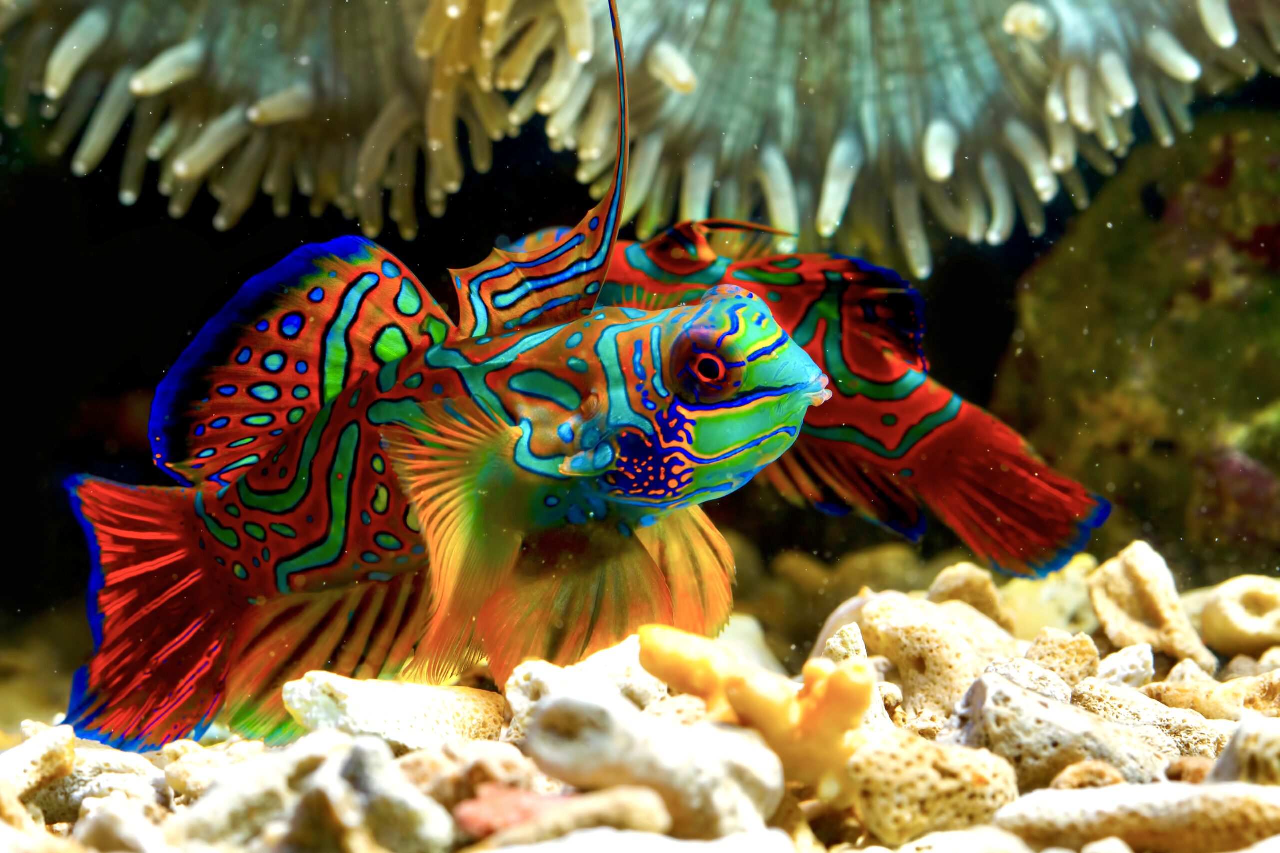 Featuring a green body with orange, blue, and black spots, the mandarin fish is easy to identify. These small fish live in the coral reefs of the Western Pacific.
