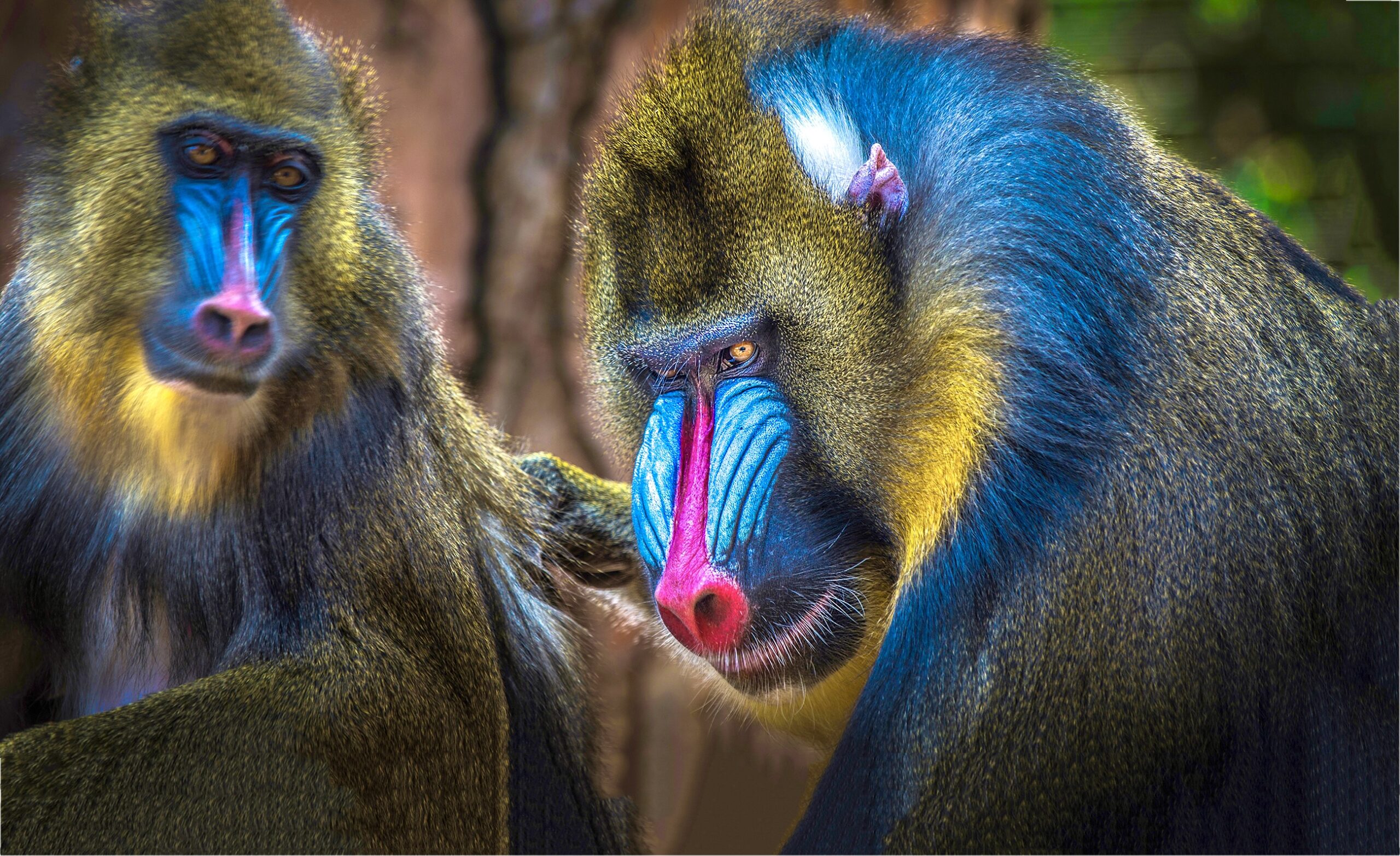 The Mandrill is one of the rare brightly colored mammals native to Africa where it is threatened due to habitat loss. It’s blue and pinkish red face becomes even brighter when excited.