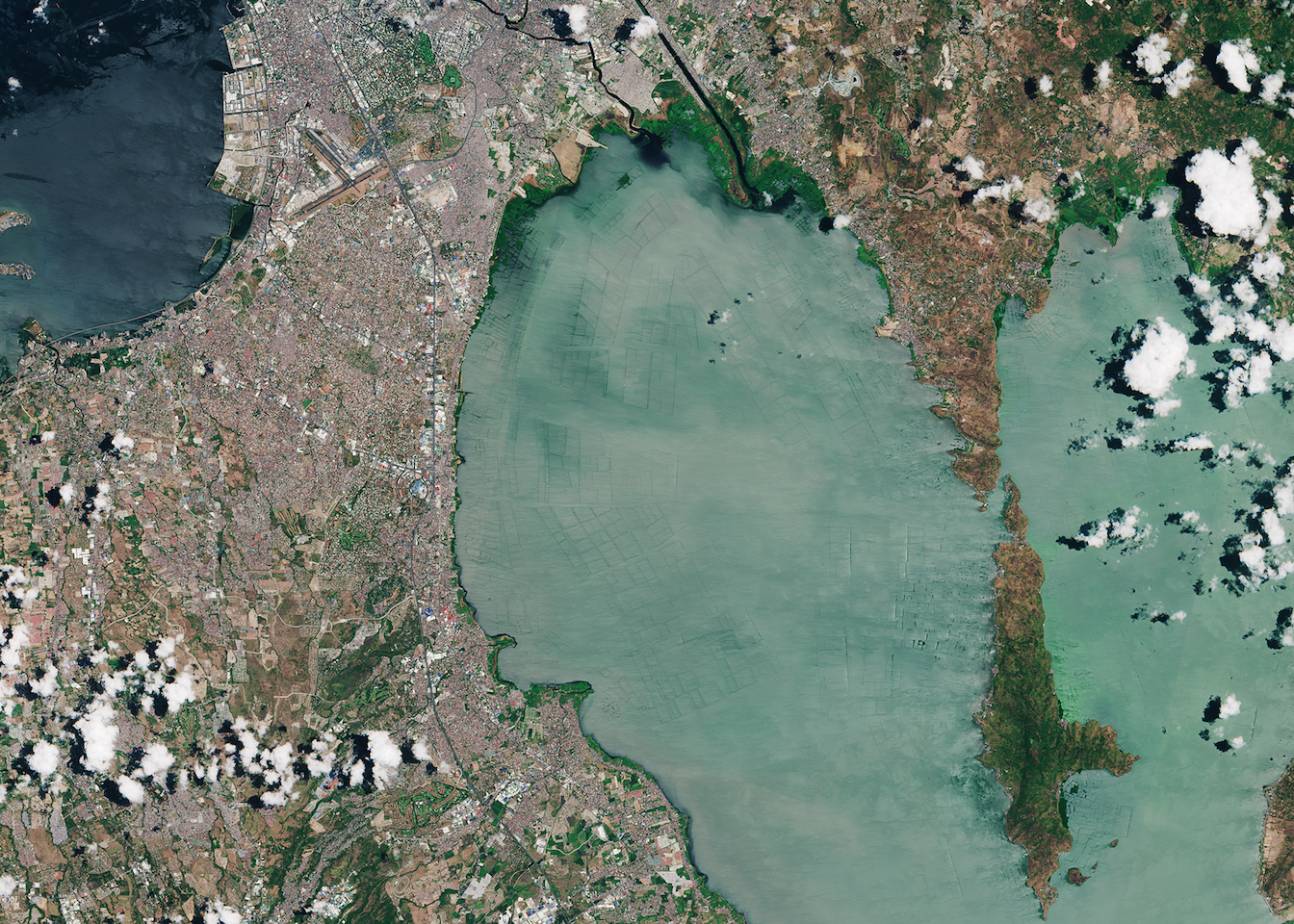 Also visible are two bodies of water with distinctly different colors. On the left is Manila Bay, which has a much darker blue color due to its much greater size and depth. Manila Bay is also known as a “pollution hotspot” with very poor water quality due to runoff carrying sewage, pesticides, and fertilizers.