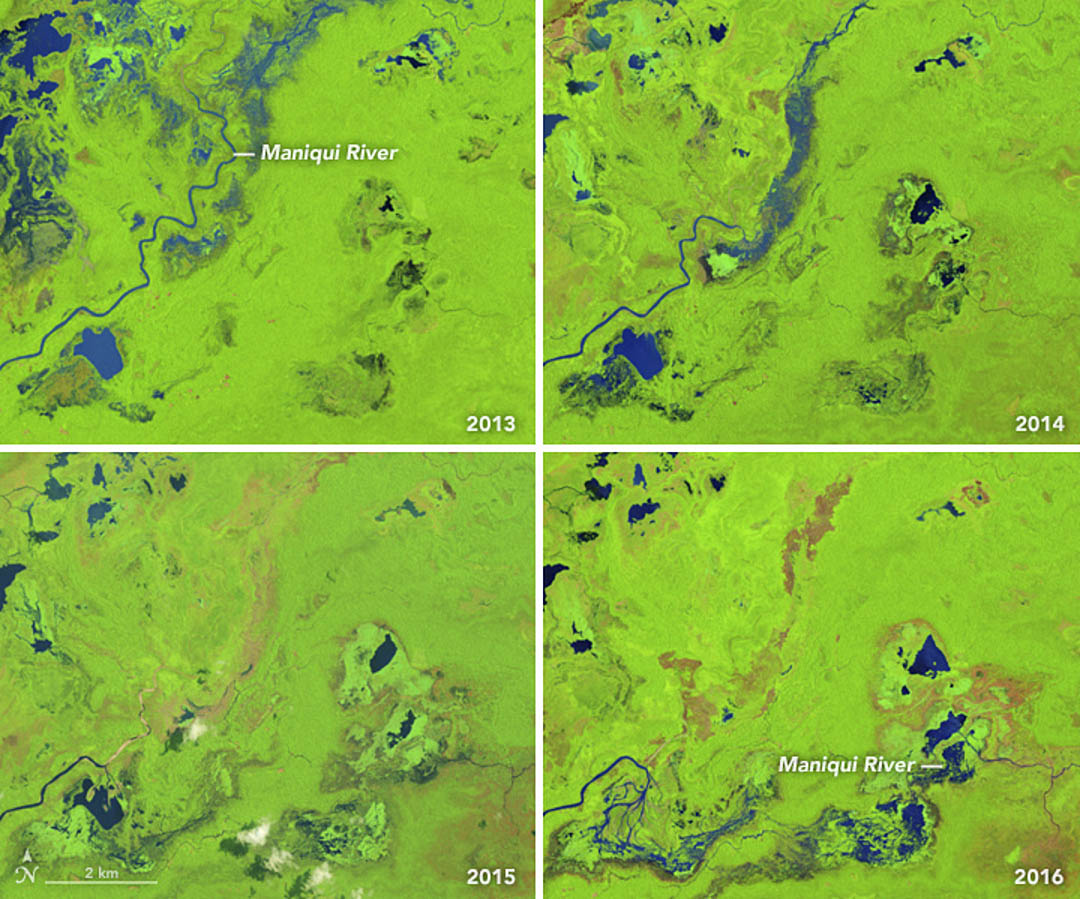 In studying the satellite images of this area, Lombardo noticed a striking example of rapid change occurring along a stretch of the Maniqui River. The image on the upper left shows the river in September 2013, flowing in a northeasterly direction. The upper right is from August of 2014, which shows the river has broken through its right bank and begun to fill a swampy depression nearby. By September of 2015, the bottom left image, the river had broken out of its channel a second time. It was now beginning to fill a pond located a few kilometers south of the first break. The last image shows that by July of 2016, sediment deposited by the river had filled most of the pond. The river was beginning to chart a more easterly path, while vegetation had begun to fill the original river channel from 2013.
