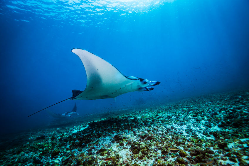 Both species are listed as vulnerable by the International Union for Conservation of Nature. Anthropogenic threats include pollution, entanglement in fishing nets, and direct harvesting for their gill rakers for use in Chinese medicine. Their slow reproductive rate exacerbates these threats. They are protected in international waters by the Convention on Migratory Species of Wild Animals, but are more vulnerable closer to shore. Areas where mantas congregate are popular with tourists. Only a few public aquariums are large enough to house them.