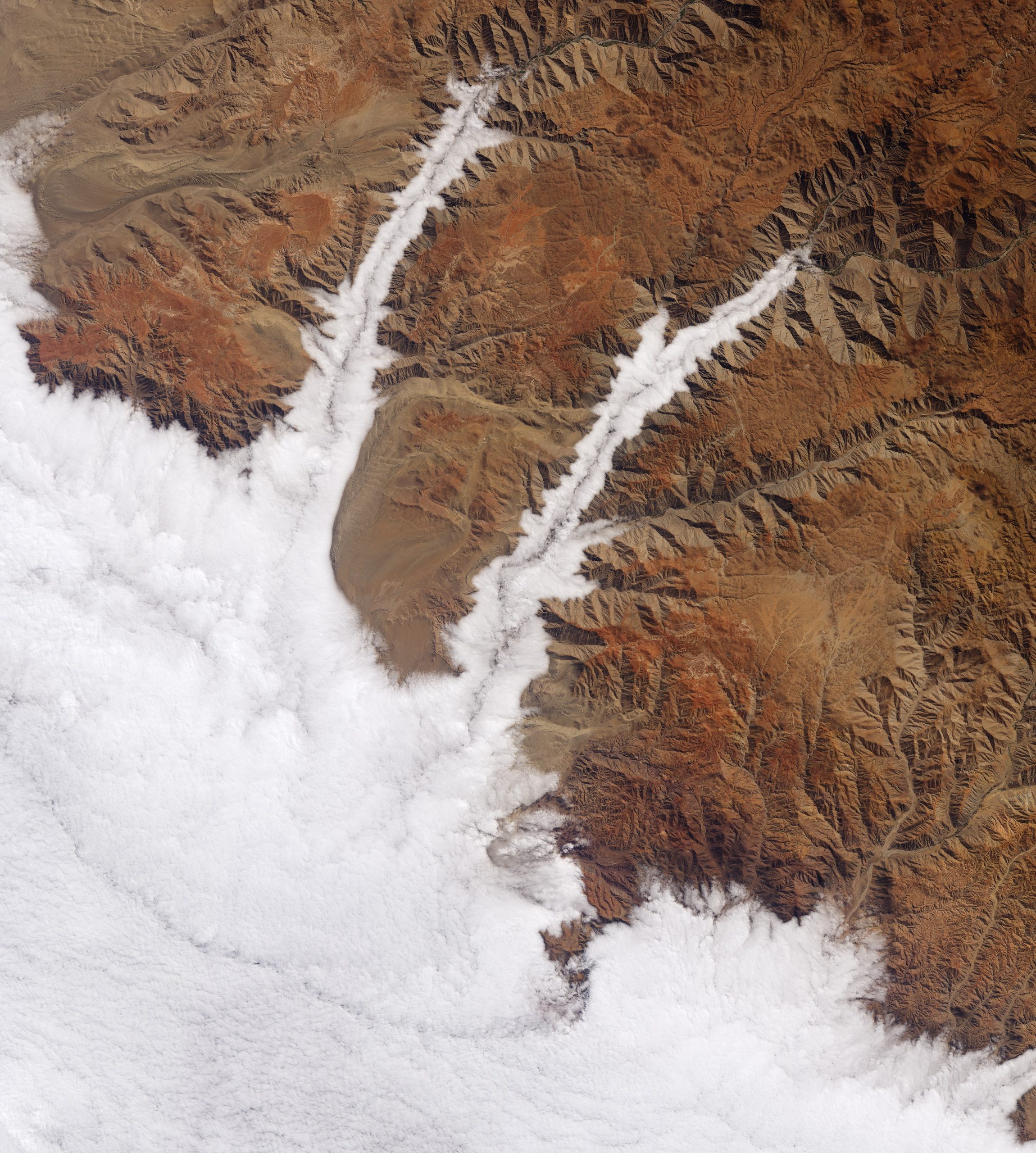 In this image, the low valleys of the Yauca and Acarí river canyons have allowed the clouds to move inland.