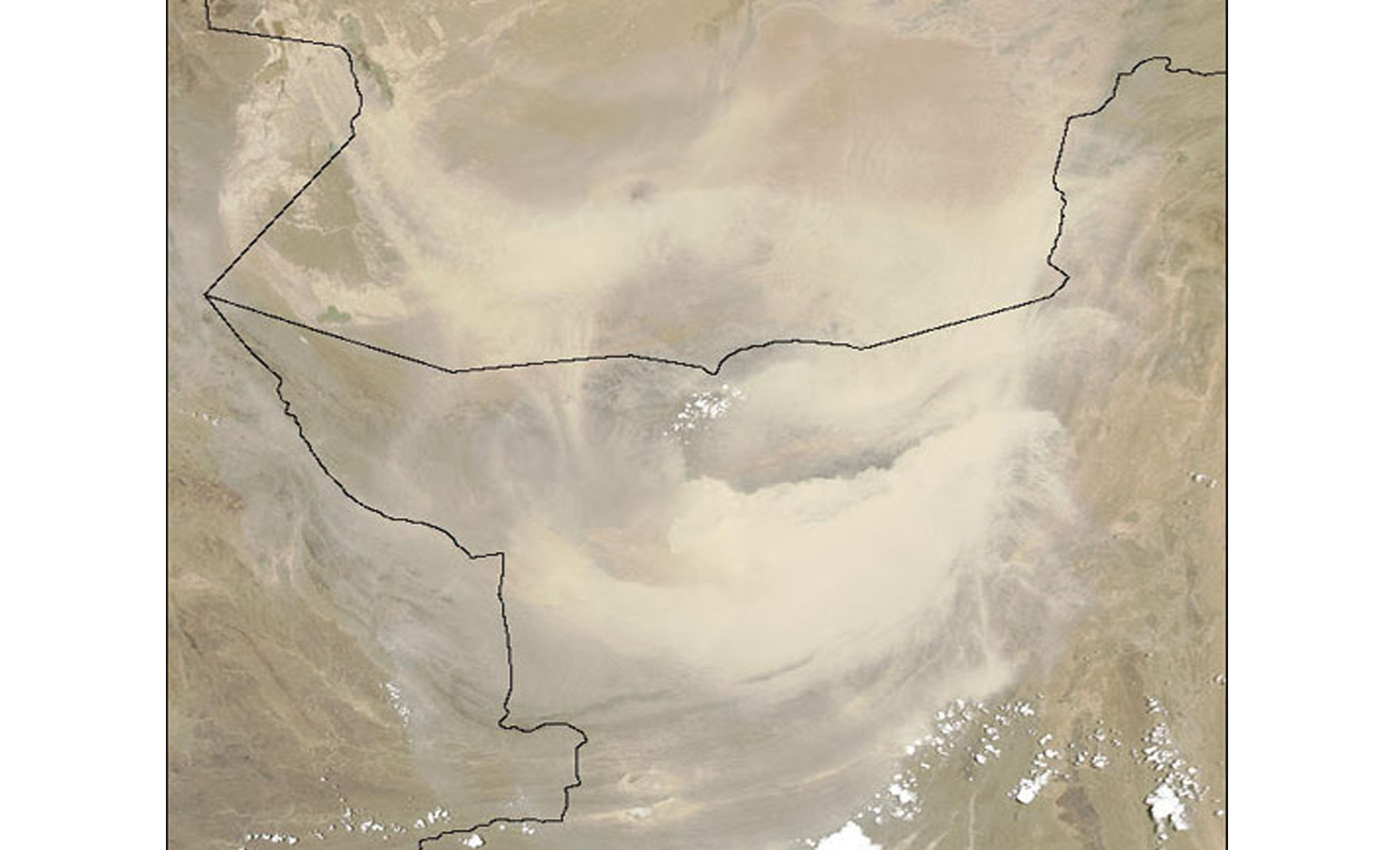 This true-color image centered over southwestern Pakistan shows a massive dust storm (tan pixels) filling the skies over much of the region. The black lines indicate Pakistan’s borders with its neighbors Iran, to the west, and Afghanistan, to the north. The bright white patches are clouds.