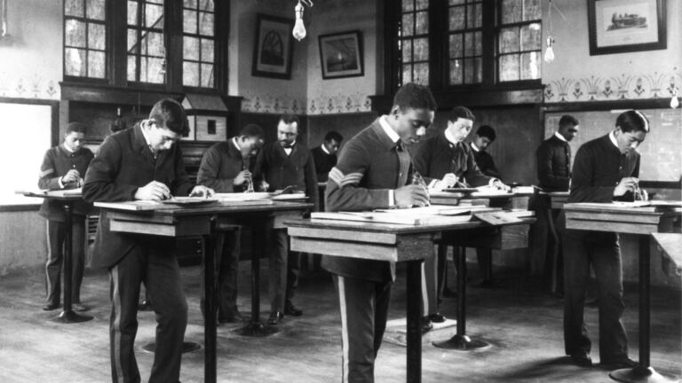 Perhaps they couldn’t afford chairs? More likely, the painstaking art of mechanical drawing, which these students are learning, is best practiced standing. Today, technical drawing by hand is largely a lost skill because of digital technology, but it was once essential to everything from engineering to architecture. These fellows are at work at the Hampton Institute in Hampton, Virginia, in 1899 or 1900. Photo Credit: Library of Congress