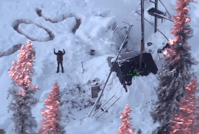 Video footage revealed how the welfare check on Steele panned out. And as the helicopter circled around the remains of the missing man’s cabin it suddenly picks up some movement in the snow. There, we can see Steele standing beside his SOS sign and waving his arms calmly above his head. Photo Credit: Facebook/Alaska State Troopers (Official)
