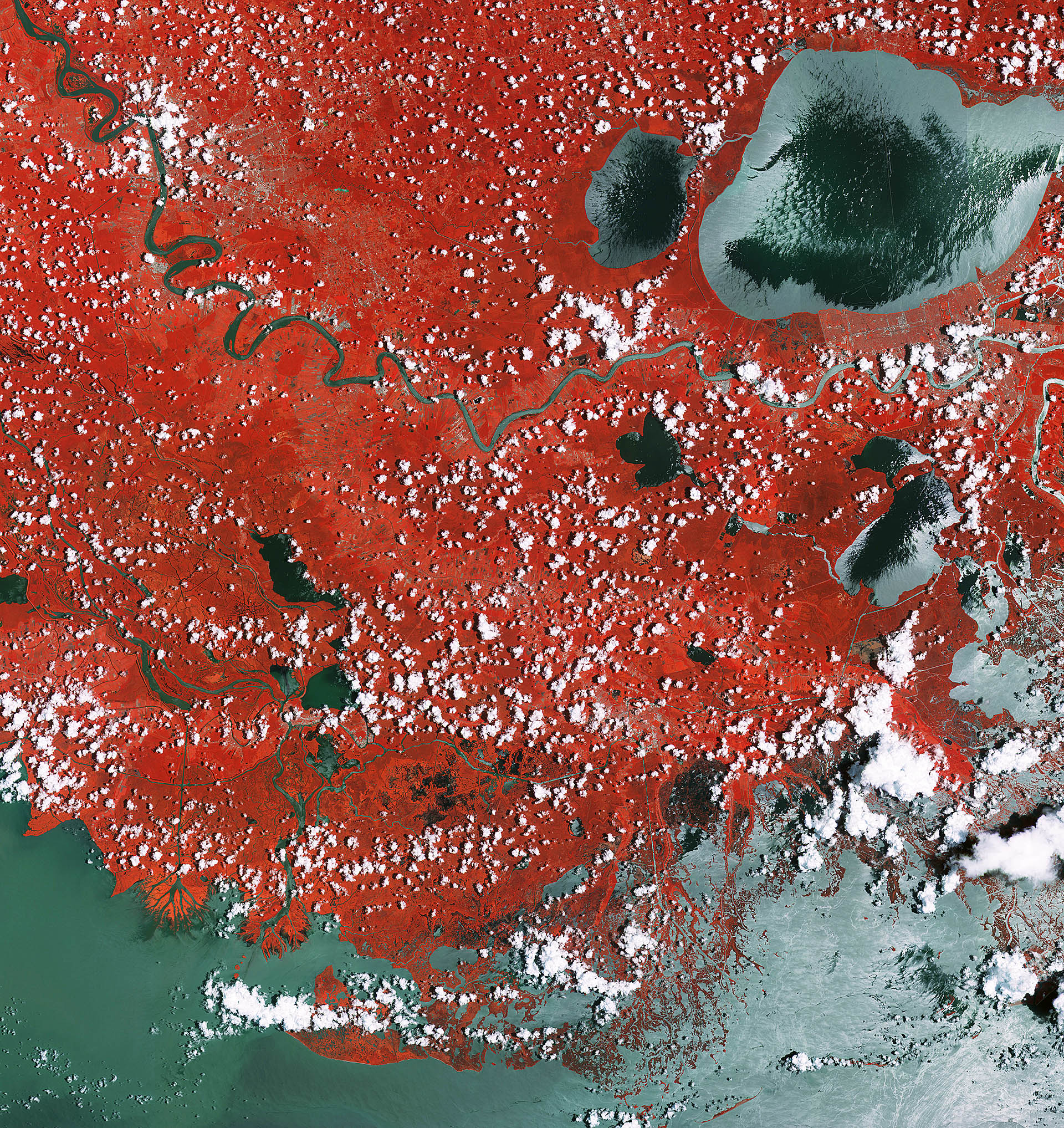 Towards the upper left part of the image, under the many clouds, lies Baton Rouge, the capital of Louisiana and its second-largest city. On the eastern bank of the Mississippi River, Baton Rouge is a major industrial, petrochemical, medical, research, motion picture and growing technology centre of the American south. The port of Baton Rouge is the ninth largest in the United States in terms of tonnage shipped.