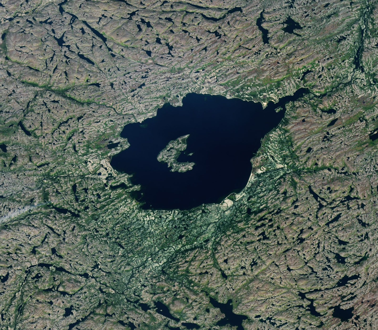 Mishta-minishtikᐡ, the lake’s arcuate central island, is interpreted to be the central uplift of the complex crater structure. The target rocks were part of a batholith composed of adamellite, mangerite and lenses of anorthosite. There are abundant shock metamorphic features exhibited in the rocks of the island. Planar deformation features, diaplectic glass, melt rocks, and shatter cones have been identified.