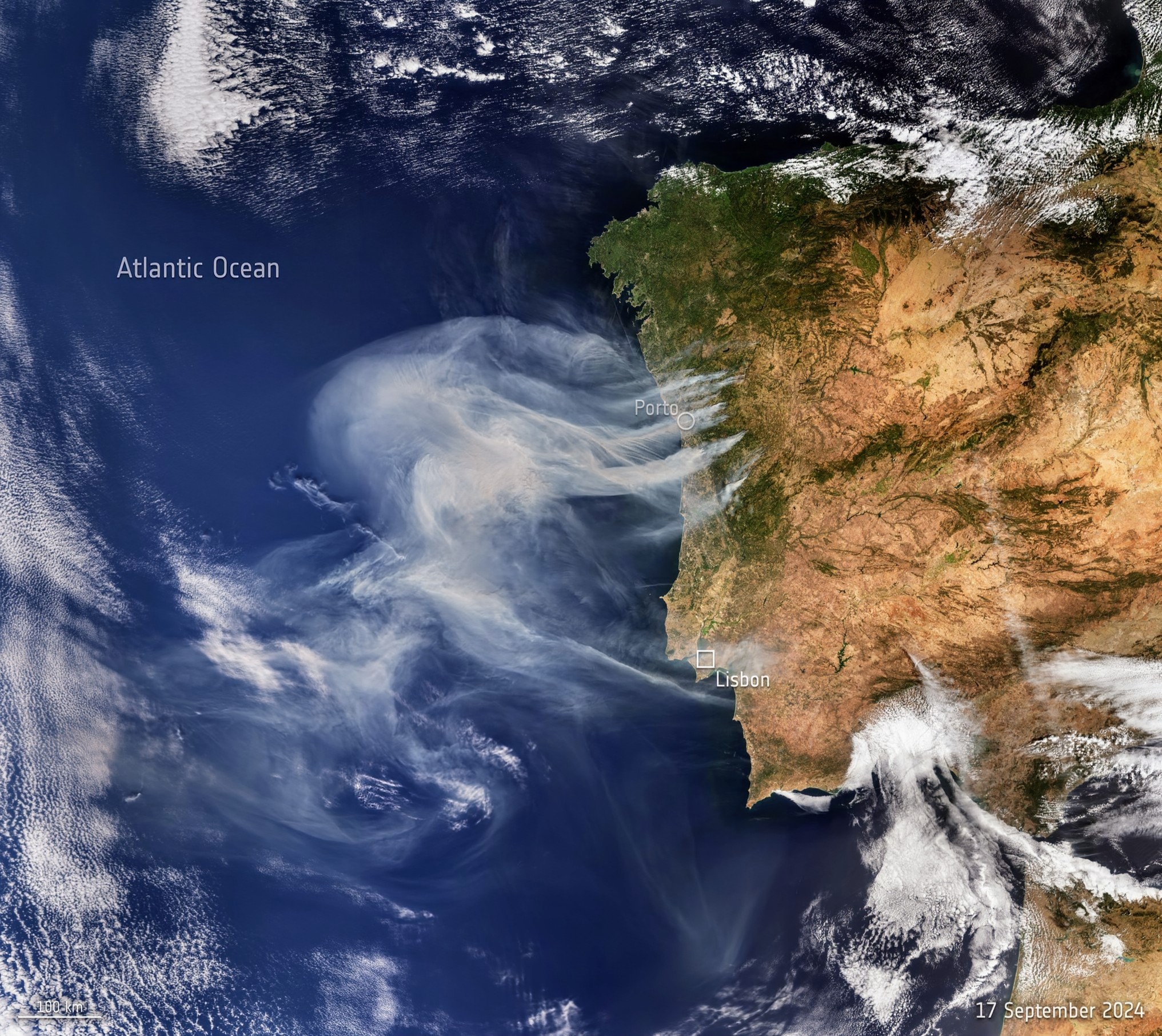 Today’s Image of the Day from the European Space Agency features smoke streaming over the Atlantic Ocean from a deadly fire outbreak in Portugal. The Copernicus Sentinel-3 image was captured on September 17, 2024.