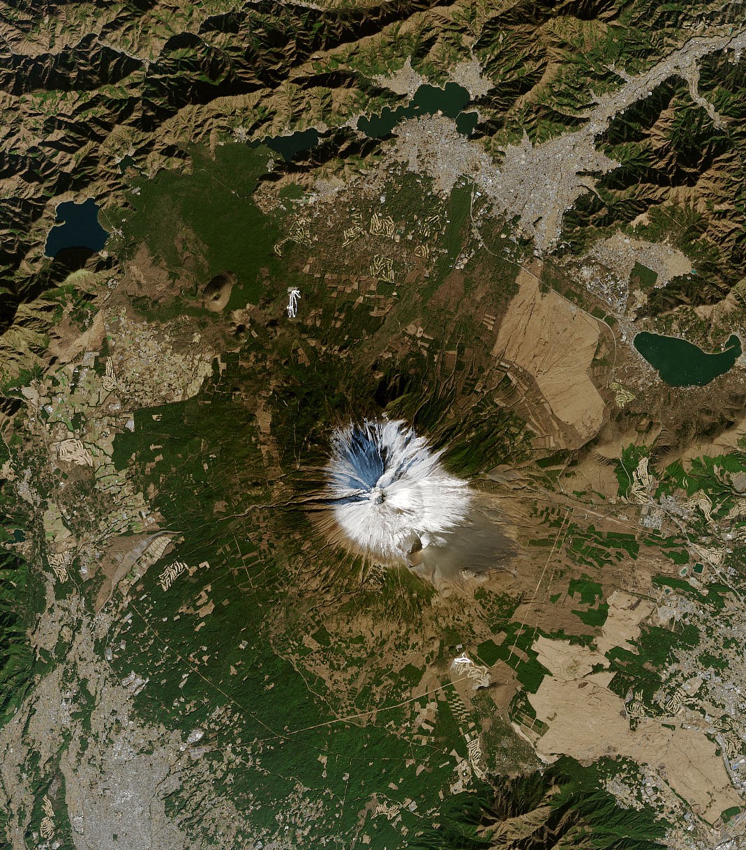 “Stations around Mount Fuji recorded much less precipitation than usual in December,” said Toshio Iguchi, a remote sensing scientist based at the NASA Goddard Space Flight Center. “Through December 24, it was only 10 percent of an average year.” Mount Fuji, located on the island of Honshū, is the highest mountain in Japan, standing 3,776.24 m. It is the second-highest volcano located on an island in Asia, and seventh-highest peak of an island on Earth. Mount Fuji is an active stratovolcano that last erupted from 1707 to 1708. The mountain stands about 100 km southwest of Tokyo and is visible from there on clear days. Mount Fuji’s exceptionally symmetrical cone, which is snow-capped for about five months of the year, is commonly used as a cultural icon of Japan and it is frequently depicted in art and photography, as well as visited by sightseers and climbers.