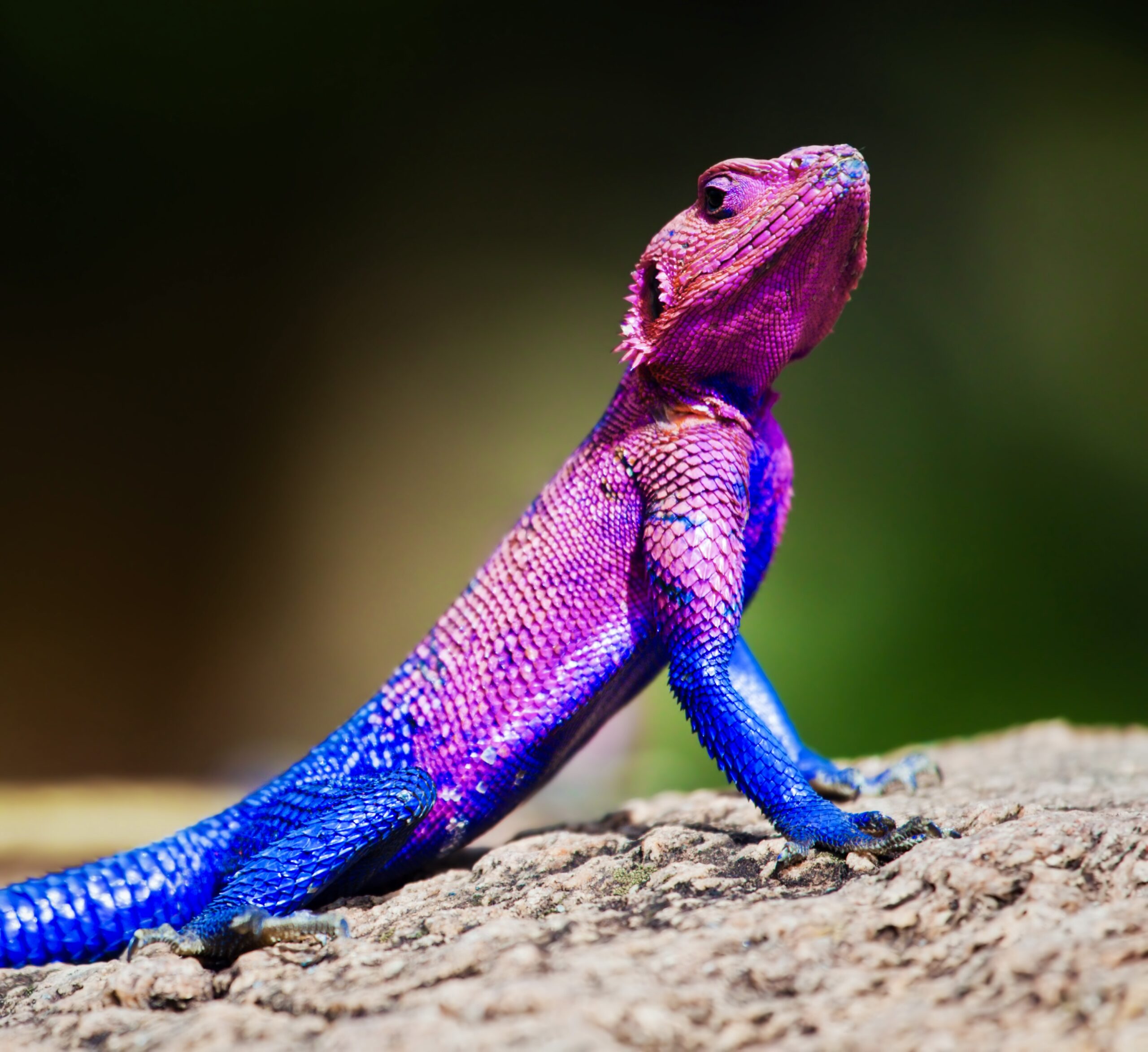 The Mwanza flat-headed rock agama or the Spider-Man agama, because of its coloration, is a lizard reptile in the family Agamidae, found in Tanzania, Rwanda, and Kenya. The male’s head, neck, and shoulders are bright red or violet, while the body is dark blue.
