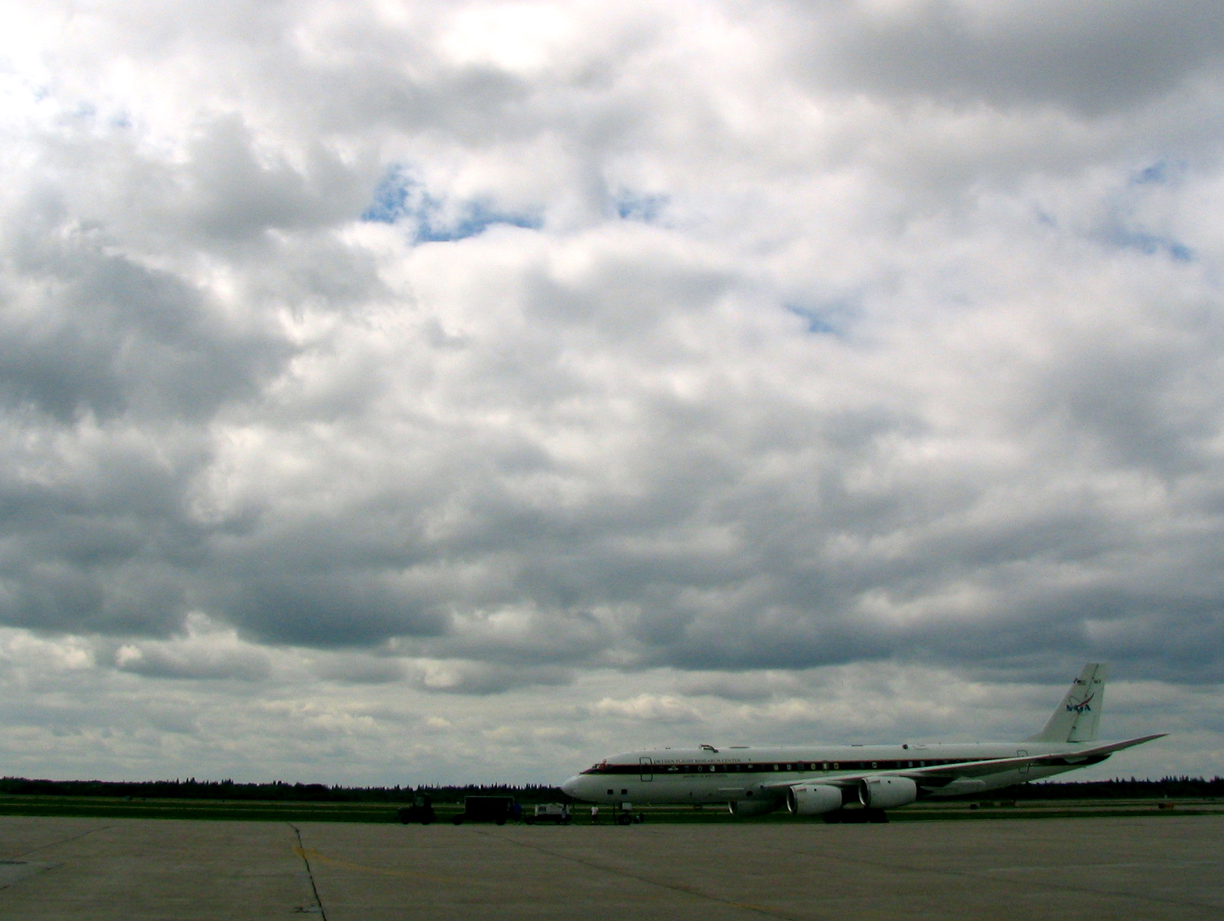 NASA’s DC-8 awaits takeoff from Cold Lake, Alberta, amid cloudy skies. Researchers hoped to locate pyrocumulus clouds, smoke plumes that take the shape of thunderstorms. Credit: NASA