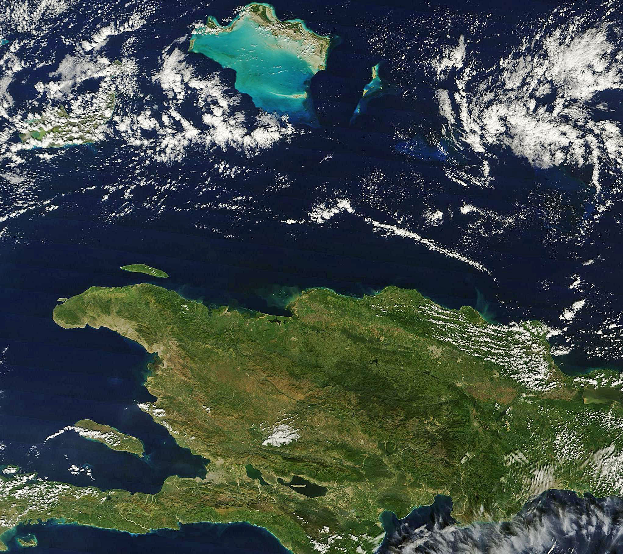 The large, long island in the lower part of the image is Hispaniola. Encompassing an area of about 29,128 square miles (76,192 square km), the second-largest island in the Caribbean after Cuba. The island is shared by Haiti (west) and the Dominican Republic (east).