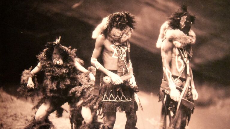 These three impressively costumed figures are Yebichai dancers of the Navajo people. The Yebichai were mythical figures who, as legend has it, created the Navajo and instructed them on how to live harmoniously with their world. As for the Navajo ceremonies themselves? They typically involved prolonged rounds of singing as well as the occasional large-scale circle dance. Photo Credit: Edward S. Curtis