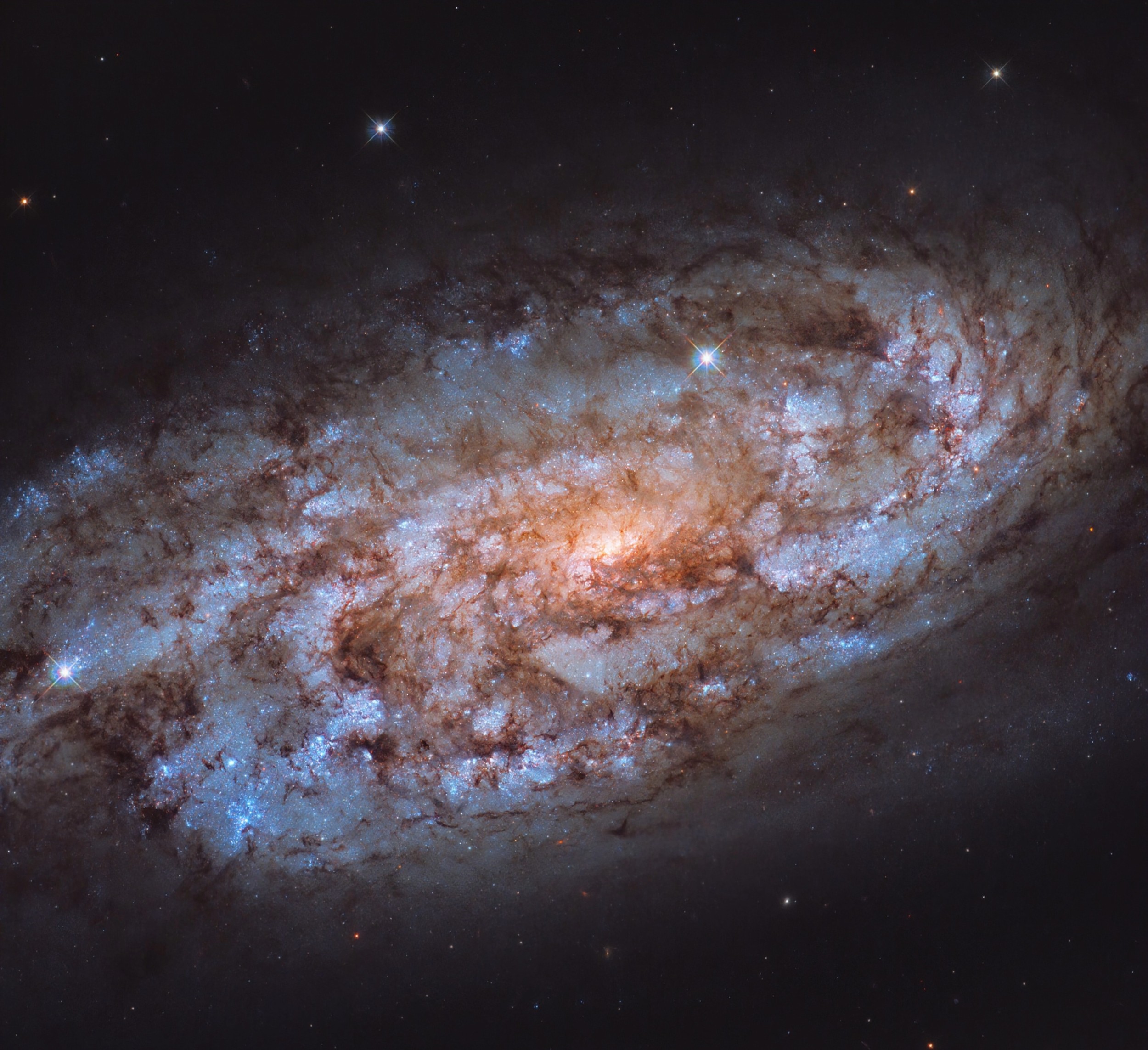 “The vast swathes of tell-tale blue seen throughout the galaxy indicate areas that are full of young, hot stars, and it is in the shades of orange, seen nearer the center, that the older, cooler stars reside.”