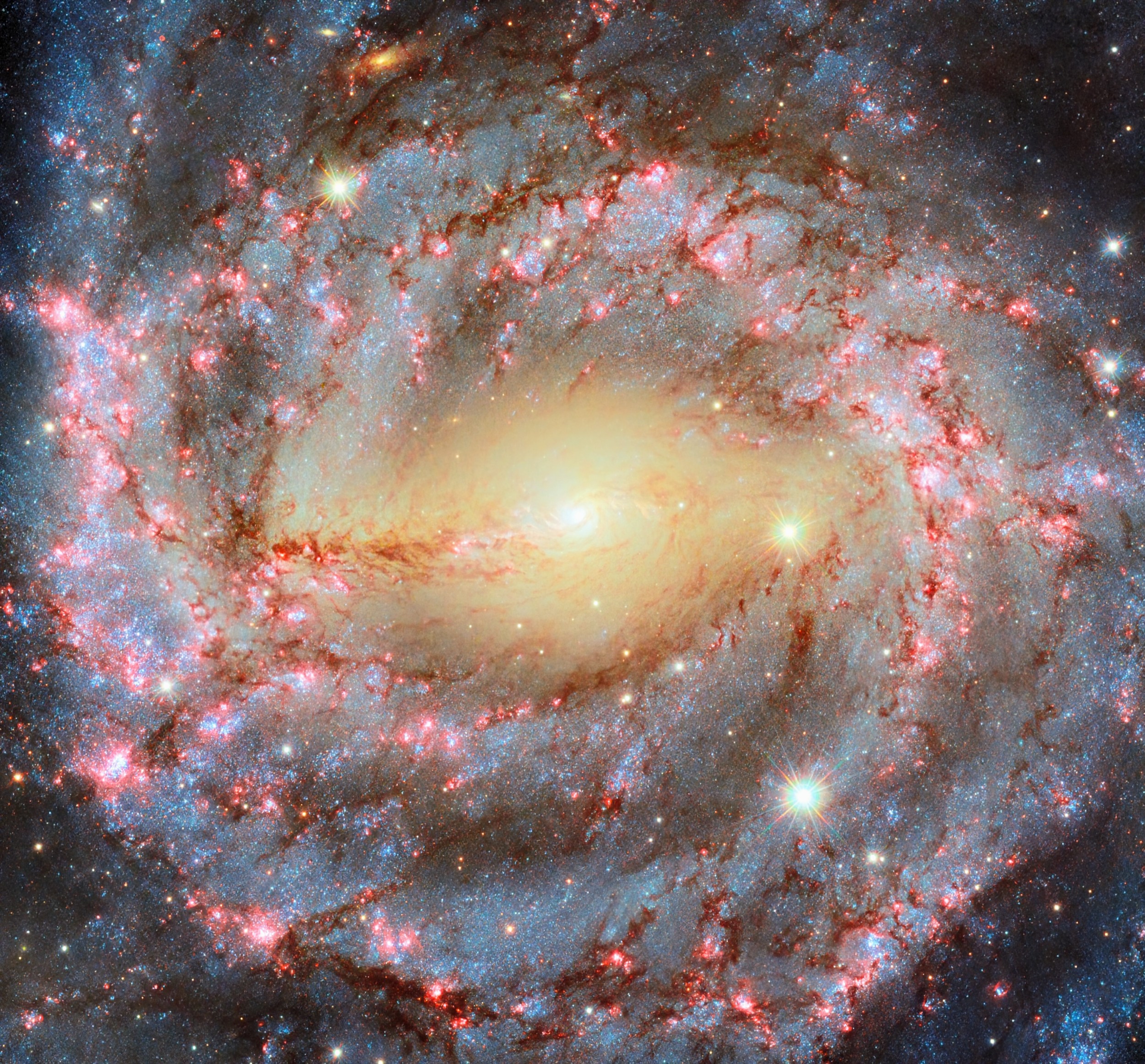 “NGC 5643 is what’s known as a grand design spiral, referring to how the galaxy’s two large, winding spiral arms are clear to see,” noted ESA. “The spiral arms are defined by bright blue stars, lacy reddish-brown dust clouds and pink star-forming regions.”