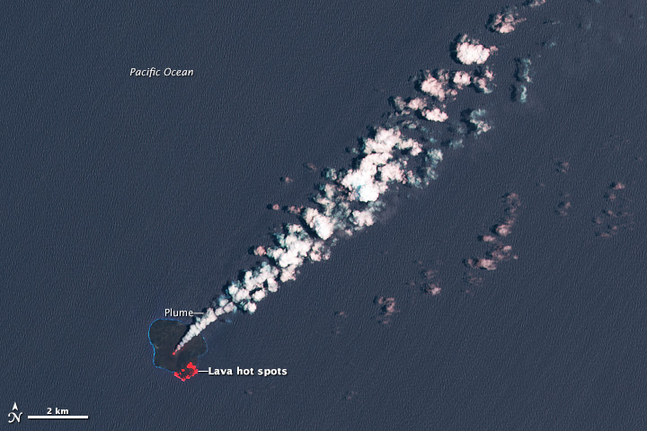 This false-color image (top) was acquired on June 21, 2015, by the Operational Land Imager (OLI) on Landsat 8. It combines shortwave infrared, near infrared, and green light (OLI bands 7-5-3). With this band combination, the plume of steam and sulfur dioxide drifting northeast appears white. Sea water is navy blue, and hot spots of lava are red. The lava is flowing toward the southeast part of the island but through tubes that prevent OLI from detecting it until it emerges in a lava delta at the edge of the island. The natural-color image (below) was acquired by OLI at the same time as the image above, though note that the band combination allows for an image with higher spatial resolution.