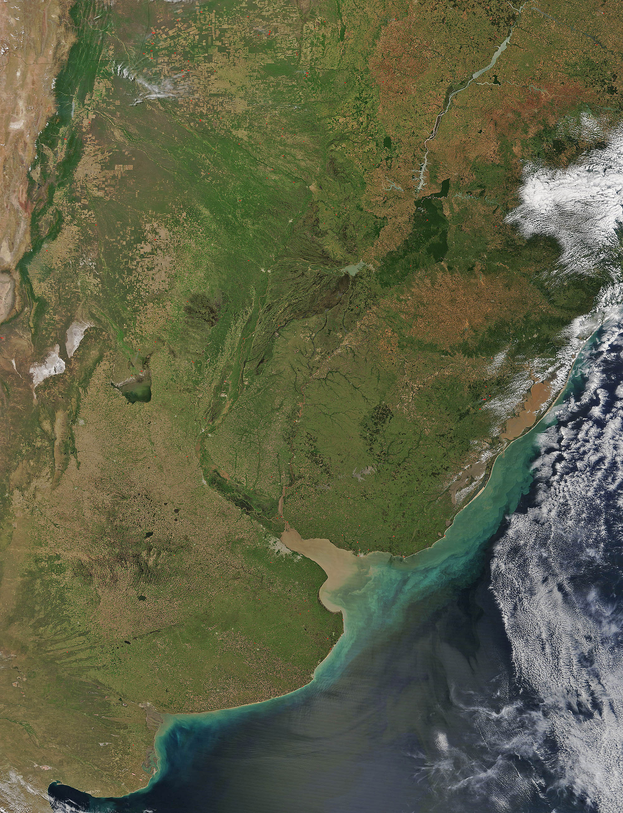 Black boundary lines were placed on the image to delineate borders between countries. Brazil lies in the northeast; Bolivia can be seen in the northwest. Uruguay sits south of Bolivia and western Brazil, with Argentina filling the southern section of the image.