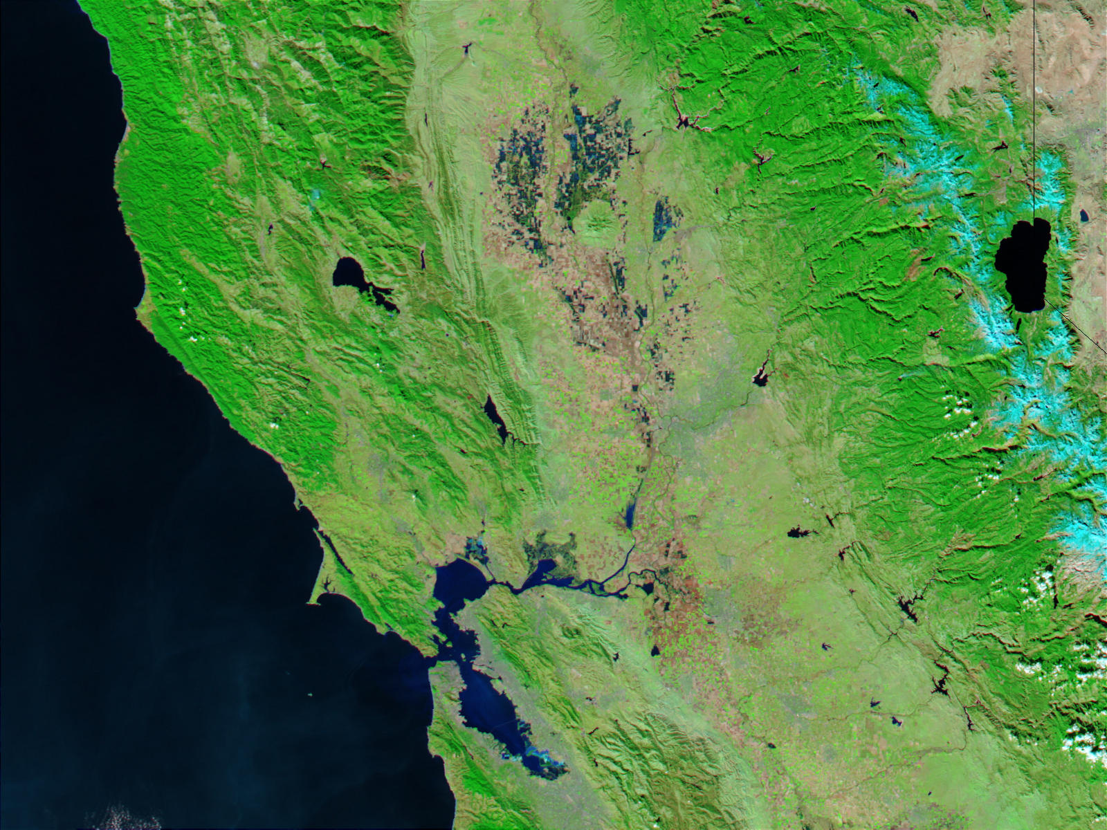 Heavy rains inundated northern California before flooding. Also in mid-December 2002 and gave rise to extensive flooding. The above true color image (right) was acquired on December 18, 2002. Also by the Moderate Resolution Imaging Spectroradiometer (MODIS). Therefore aboard the Aqua satellite. The image shows some of the worst of the flooding around the lakes and tributaries surrounding the Sacramento and Feather rivers north of San Francisco Bay. Normally only small sections of these rivers would be visible in the MODIS image (left, acquired December 2, 2002).