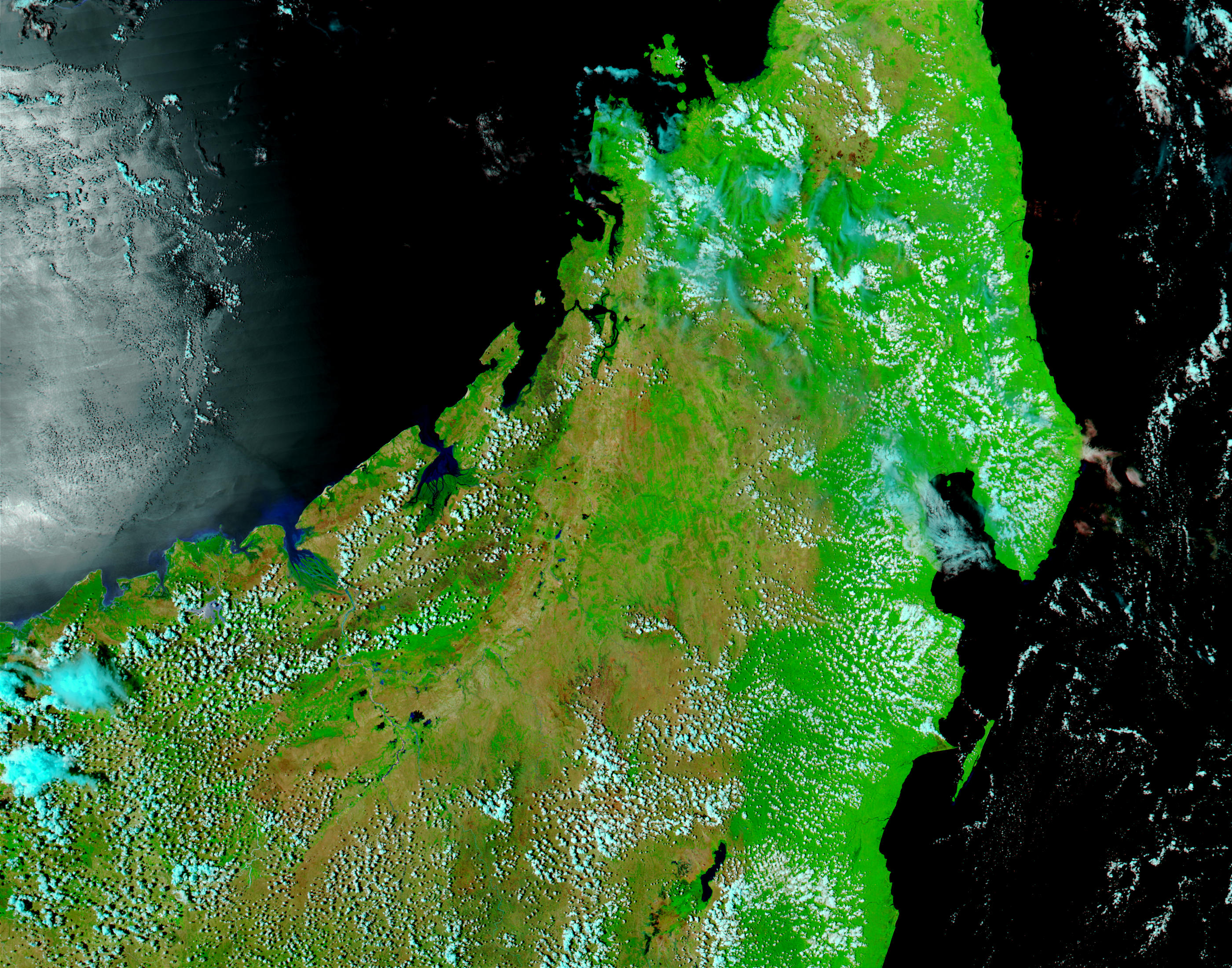 In January, two weeks of heavy rain inundated northern Madagascar just before the island was struck by Cyclone Fari. This series of images by the Moderate Resolution Imaging Spectroradiometer (MODIS) instruments aboard NASA.s Terra and Aqua satellites displays flooding in northwest Madagascar on January 31, 2003. Prior to being hit by the cyclone, floods throughout the country killed 13 people and forced several thousand from their homes.