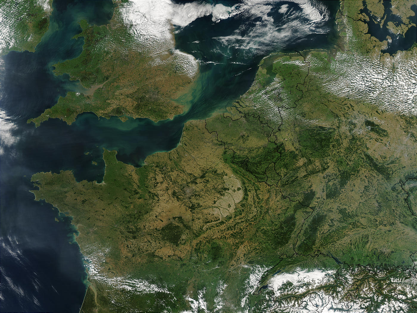 Much of northwestern Europe is shown in this true-color Aqua MODIS image from September 13, 2002. From upper left are Ireland, England, France, Belgium, the Netherlands, Germany, Denmark, Austria, and Switzerland. Although London and Paris are both visible at the 1-kilometer resolutions as dark gray patches on the landscape. Sate Imaging shows you the whole lay out and landscape of this northwest region. Therefore showing you the distance between each city and the bay and sea. You can see a very clear image showing you the landscape.