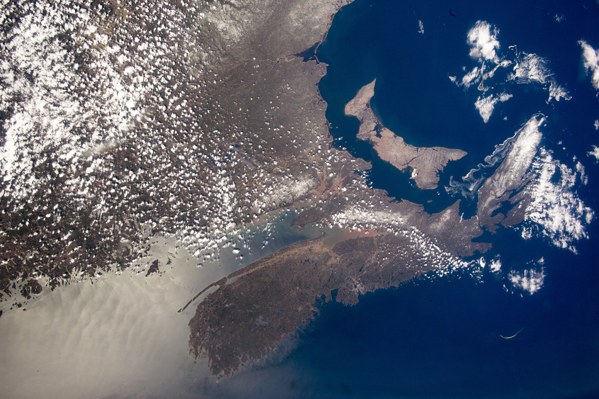 Nova Scotia and Prince Edward Island. An astronaut aboard the International Space Station shot a near-vertical (nadir) photograph of Nova Scotia with a wide-angle lens. Taken at nearly the same focal length as the human eye, the image (top) allows us to experience Earth as the crew sees it. The second image is simply a tighter crop of the first.