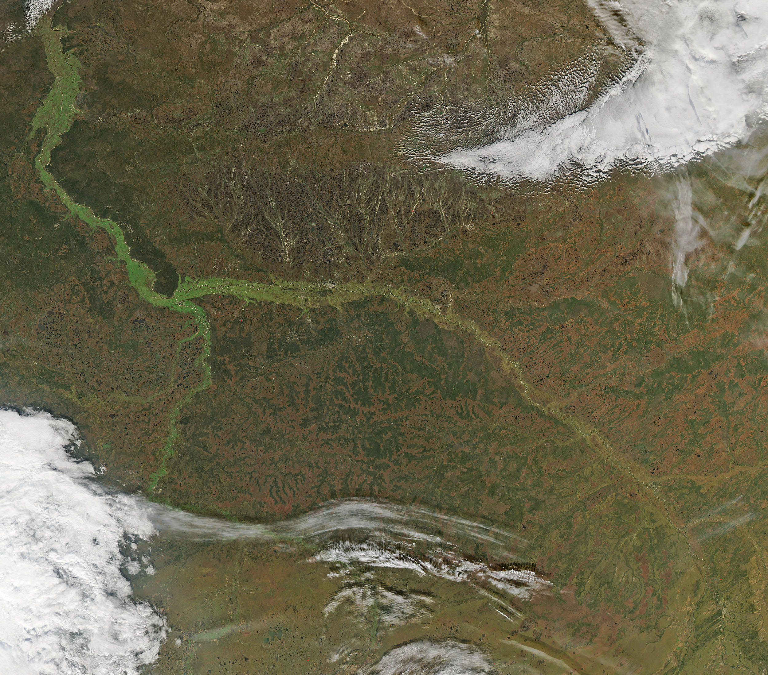 The lush green of the Ob River Valley snakes through the early autumn landscape of Siberia in this true-color image acquired by the Moderate Resolution Imaging Spectroradiometer (MODIS) aboard NASA’s Aqua satellite on September 30, 2016.