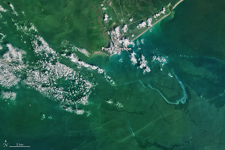 Today’s Image of the Day from NASA Earth Observatory shows oil slicks off the coast of southeastern Louisiana near Port Fourchon, a major hub of the oil and gas industry.
