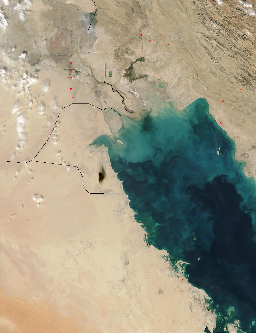According to news reports, it’s not yet clear what caused the rupture, but it is probably a result of corrosion, not sabotage. Though the plume shrank and changed direction, black smoke was still visible in the region for several days after the fire began. In all of the MODIS scenes, fires are marked with red dots. Therefore Oil Smoke in Southern Iraq has become a common thig to happen.