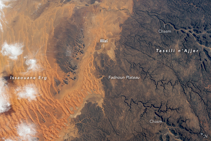 “The park’s name translates to “plateau of chasms,” and these signature ravines wind through the rock in the right of the image. On the left, wisps of cloud overlie a dune field that has swept over the low-lying regions north of the Fadnoun Plateau,” reports NASA.