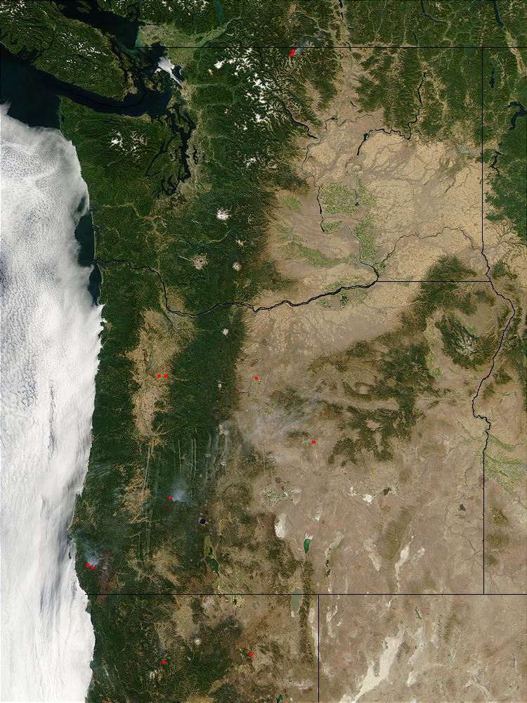 Oregon and Washington. This true-color Moderate Resolution Imaging Spectroradiometer (MODIS) image from September 11, 2002. It shows Washington (top), Oregon (middle), and a bit of northern California at bottom. The fires spread pretty rapidly and you can see in the imaging resolution. Therefore there is a huge border of where the fire had spread.
