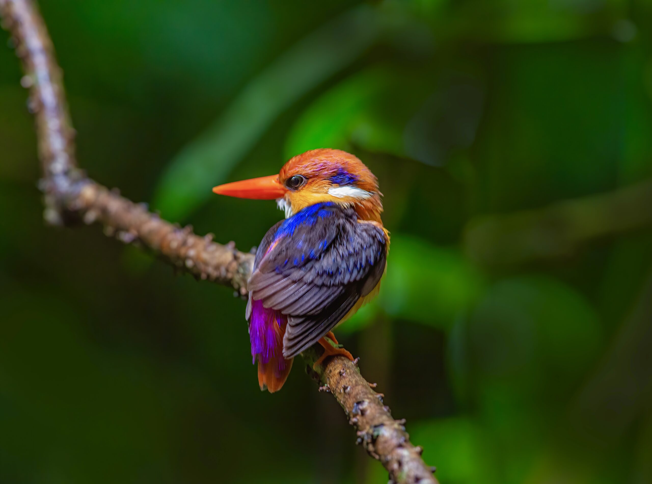 Found in lowland forests of regions such as India and Southeast Asia, this small kingfisher glows with vivid yellow, red, pink, orange, and midnight blue.