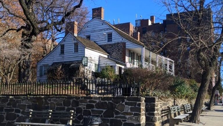 To say that this farmhouse stands out like a sore thumb would be an understatement! It sits in the Inwood area of Manhattan on Broadway and 204th Street. Looming over it are what look to be high-rise apartment blocks or offices, and traffic whizzes by on the busy road out front. Photo Credit: Instagram/dyckmanfarmhouse