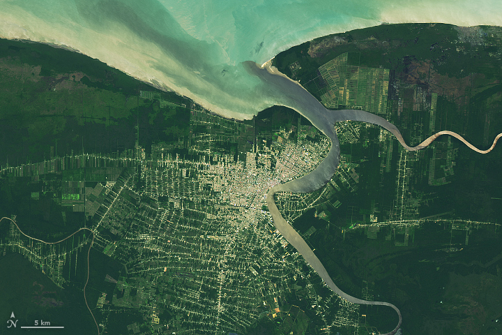 Today’s Image of the Day from NASA Earth Observatory features Paramaribo, the capital city of Suriname at the mouth of the Suriname River. The United Nations (UN) has designated part of the city center as a world heritage site.