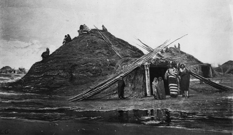 Pawnee Natives lived in earthen homes. These abodes were shaped with wooden frames and covered with compacted dirt, and the round houses in this picture were built near Loup, Nebraska. When they traveled, Pawnees sheltered in buffalo-hide tipis (teepees). Tipis were the perfect portable tents to keep the travelers warm and comfortable. Photo Credit: William Henry Jackson/Getty Images