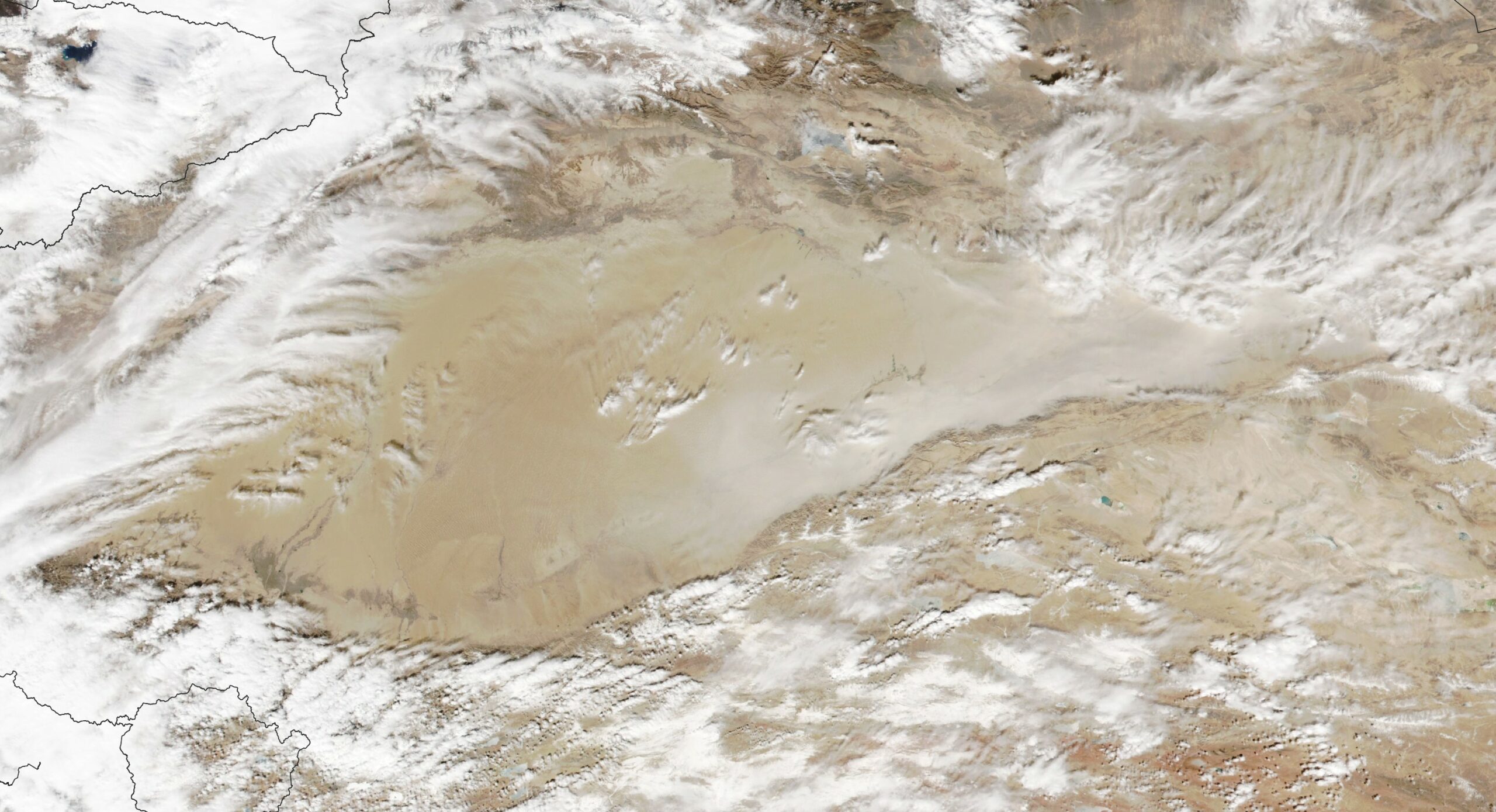 Today’s Image of the Day from NASA Earth Observatory features the Taklamakan desert in Xinjiang province in western China. The photo shows a cloud of dust moving over the Tarim Basin.