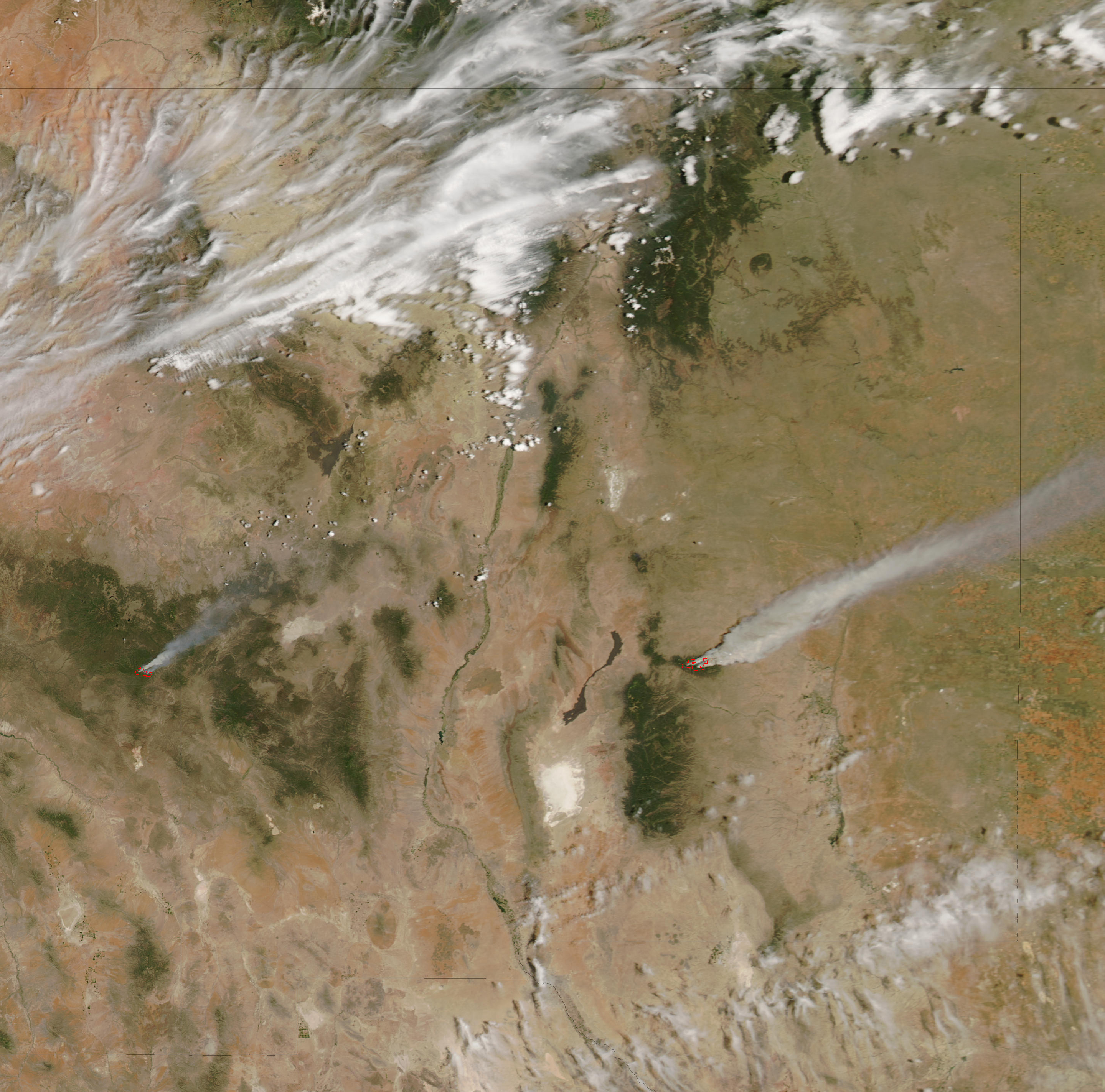 Started on May 15, 2004, and almost contained by the weekend of May 22, the Peppin Fire (center) on El Capitan Mountain in New Mexico, roared back to life early in the week of May 24 due to dry conditions and strong winds. According to news reports, two dozen homes were evacuated in the area and portions of several roads had to be closed. Current estimates from the National Interagency Fire Center are that more than 9,000 acres had been affected by the blaze as of May 25.