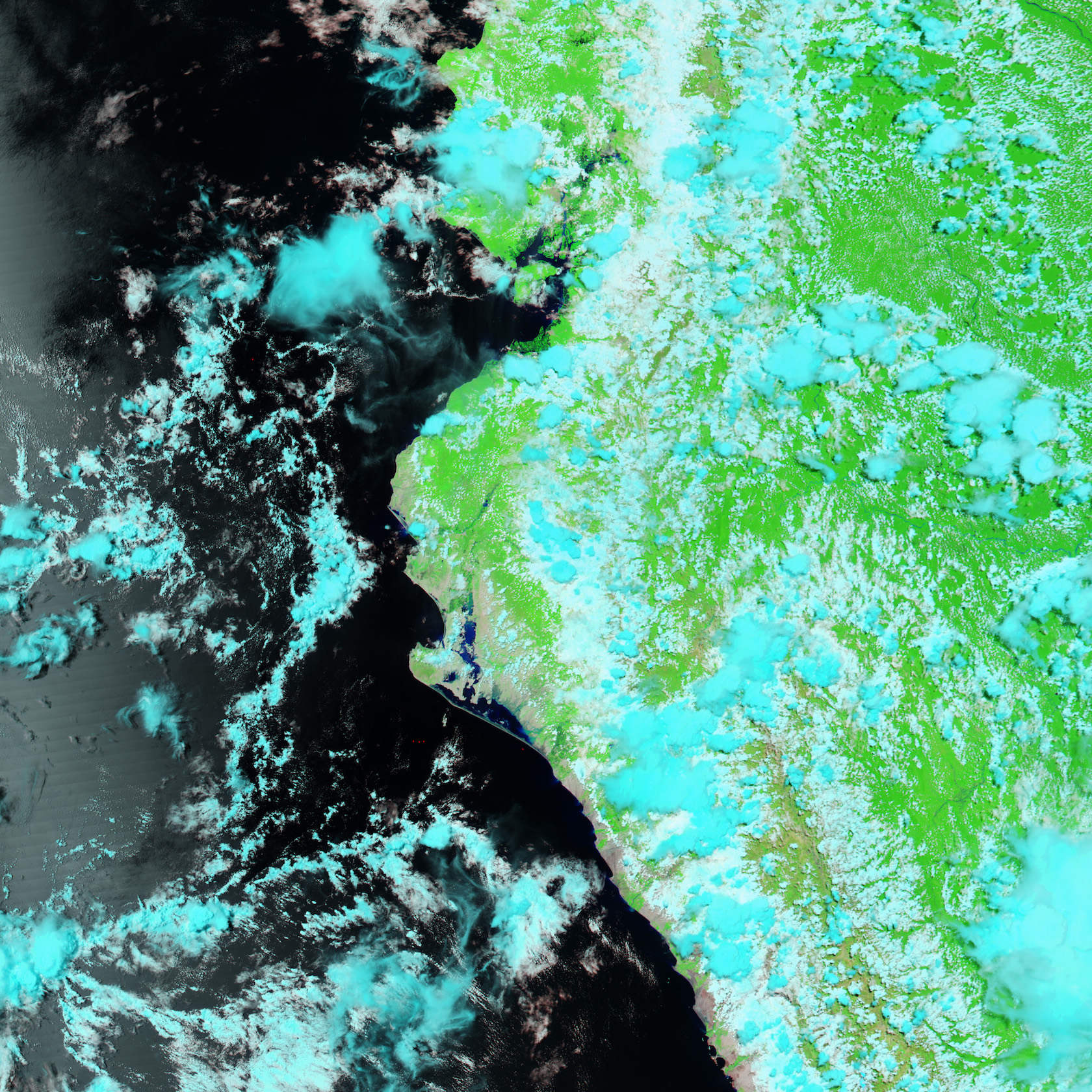 This false-color image was taken by the Moderate Resolution Imaging Spectroradiometer on NASA’s Aqua satellite. In the center, Lago La Niña and the Piura River can both be seen spilling over their banks.