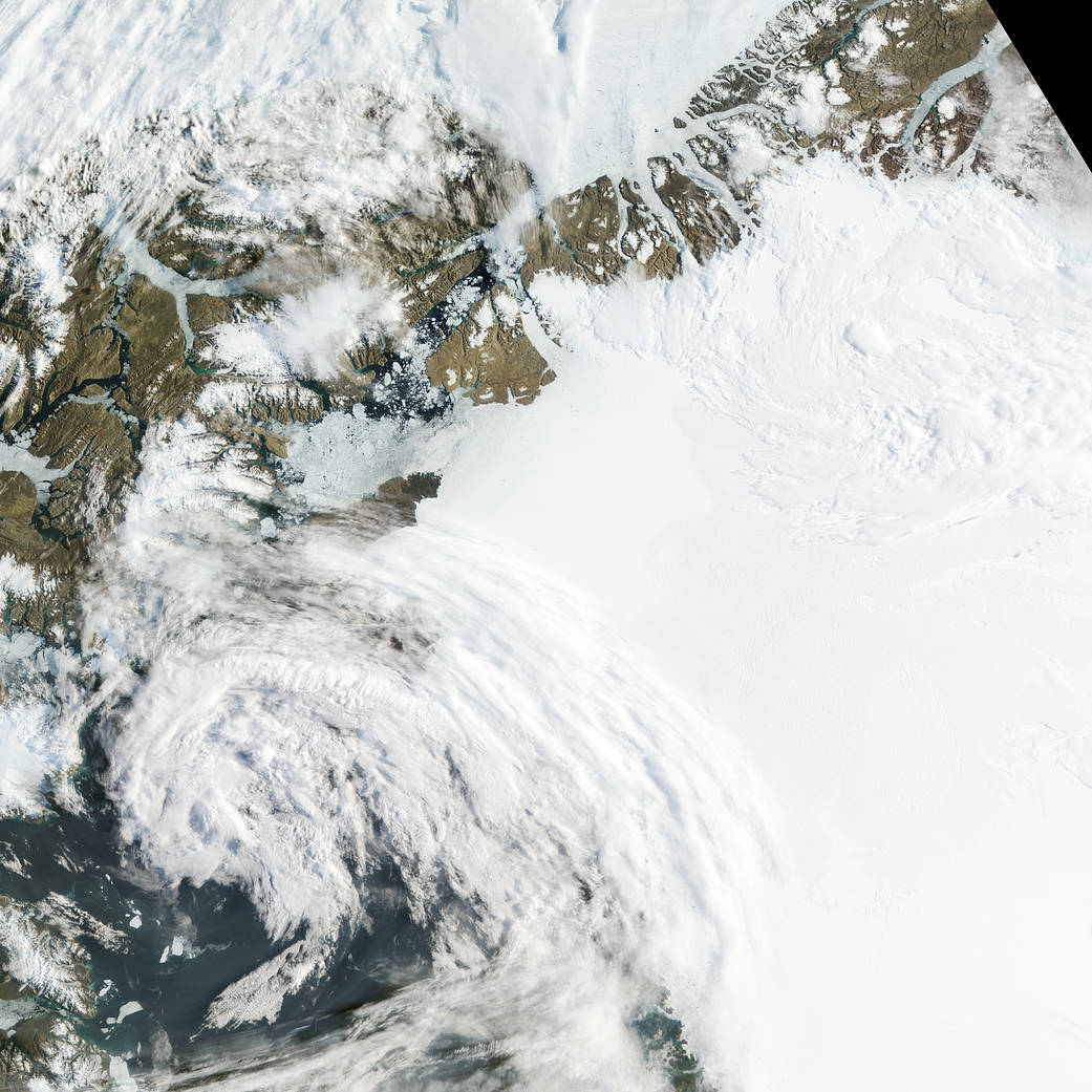 The Moderate Resolution Imaging Spectroradiometer, or MODIS, on NASA’s Aqua satellite observed the new iceberg calving and drifting downstream on July 16–17, 2012. Because Aqua is a polar-orbiting satellite, it makes multiple passes over the polar regions each day.