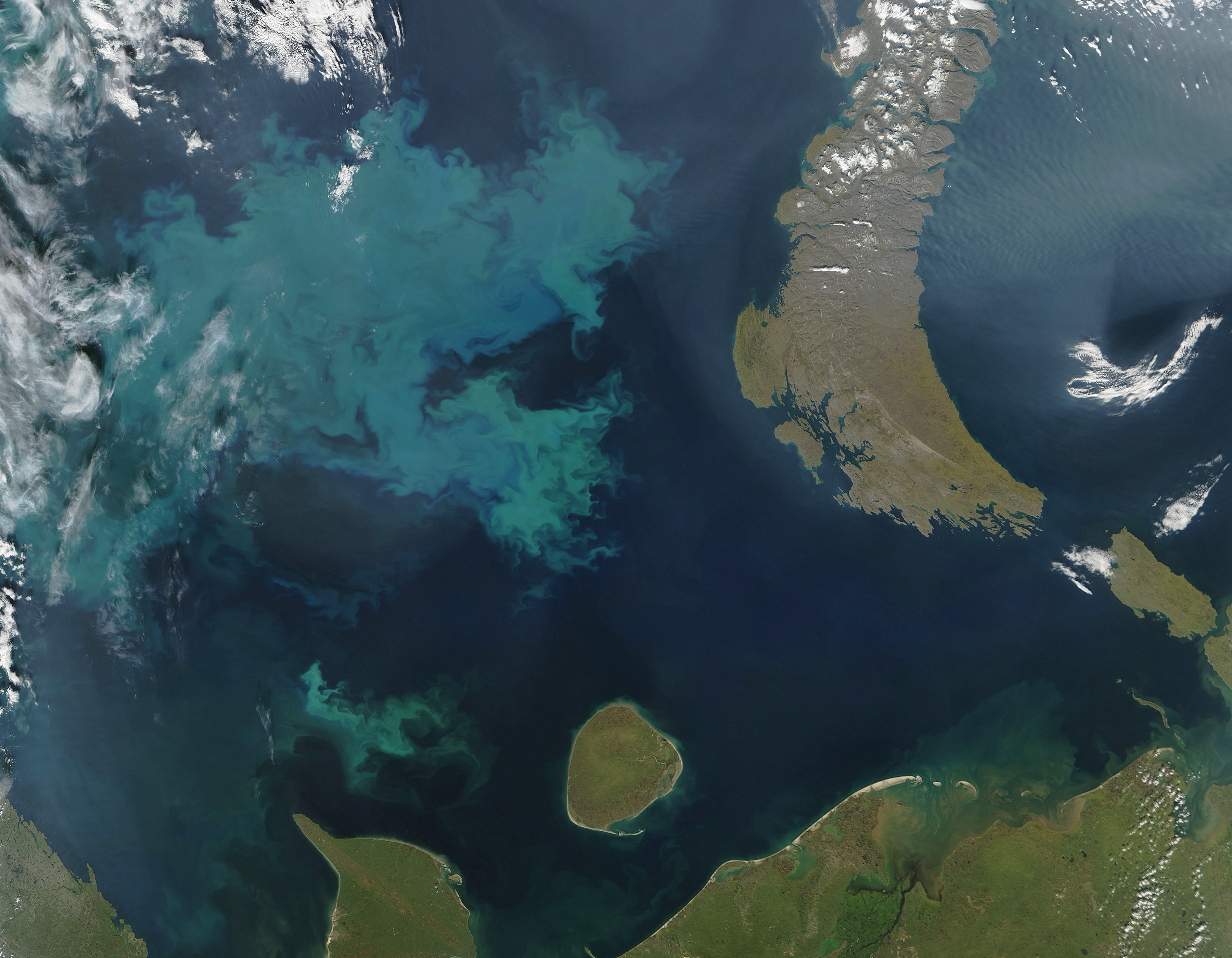 Brilliant colors painted across the blue waters of the Bering Sea marked a dramatic phytoplankton bloom in late August 2016.