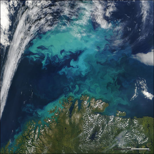 Phytoplankton bloom near Norway form brilliant swirls of green in the Barents Sea north of Norway. Phytoplankton are microscopic marine organisms that thrive in nutrient-rich cold waters. The striking turquoise color is caused in part by sunlight reflecting off of chlorophyll in the phytoplankton, which (like terrestrial plants) use the process of photosynthesis to create carbohydrates from carbon dioxide and water.