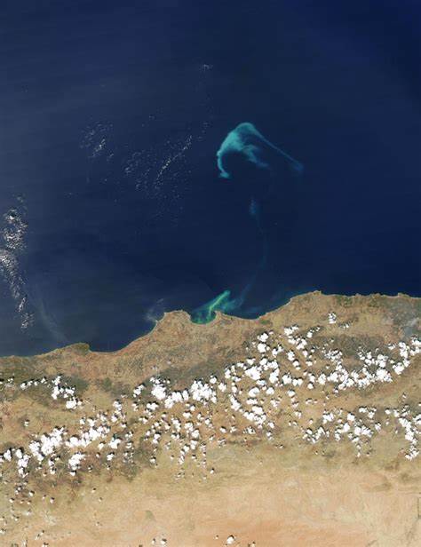 Phytoplankton Bloom off Algeria. After a particularly large storm over northern Algeria on August 10, 2003, a pale blue-green bloom appeared in the waters just off the coast near the mouth of Bay of Algiers. The rainstorm likely washed nutrients such as sewage into the water. These nutrients spurred the growth of microscopic marine plants, called phytoplankton. The phytoplankton grew in such large quantities that the bloom became visible from space, as shown in this series of Moderate Resolution Imaging Spectroradiometer (MODIS) images from August 10 – August 13, 2003.