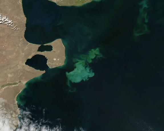 Phytoplankton bloom off Argentina with brilliant streaks of blue and duller swirls of green color the South Atlantic Ocean in this Terra MODIS image acquired on January 4, 2005. The colors are a result of millions of microscopic plants growing near the surface of the water.
