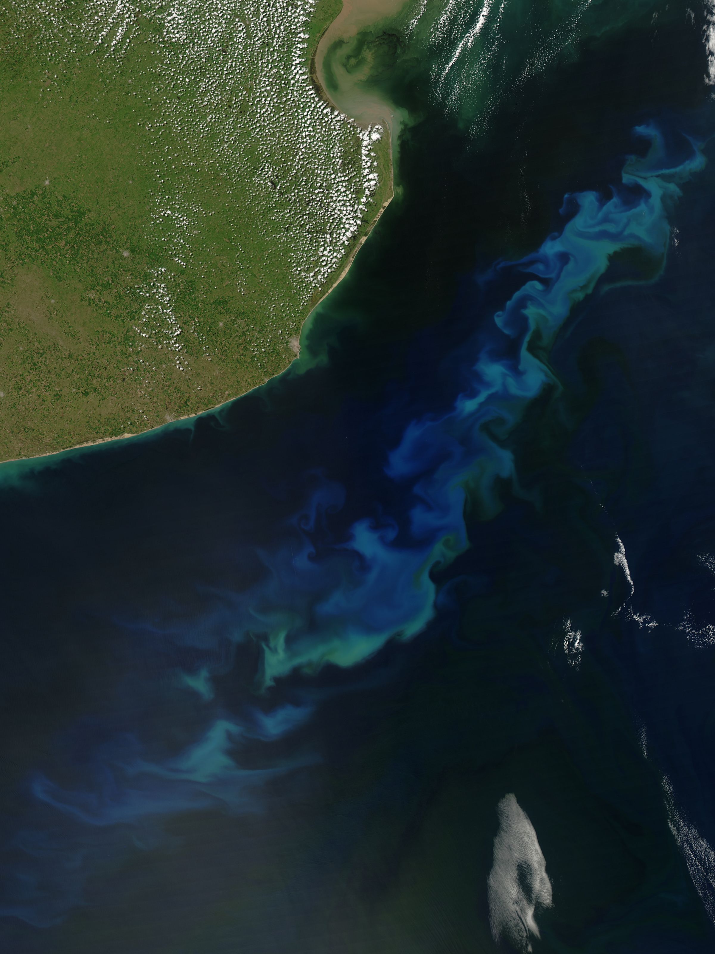 A phytoplankton bloom off chile creates a vibrant blue cloud off of the coast. Phytoplankton are tiny, microscopic plants that form the base of the food web in marine ecosystems; they are consumed by zooplankton, or microscopic animals, which in turn are eaten by variety of fish, whales, and birds. Often blooms such as this one are fed by the upwelling of nutrients. Therefore occur when currents beneath the surface reach the coastline and are forced to the surface.