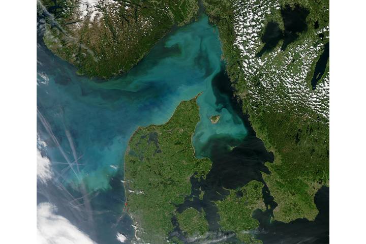 Phytoplankton Bloom off Denmark. Swirling green clouds of phytoplankton bloom in the North Sea, the Skagerrak, and the Kattegat straits between Norway and Denmark in this summertime image acquired on May 23, 2004, by the Moderate Resolution Imaging Spectroradiometer (MODIS) on the Aqua satellite. Save for the highest points, Norway and Denmark glow with rich green vegetation. The blooms of phytoplankton in the water, like land-based vegetation, thrive off of sunlight, which they use to convert nutrients in the water into energy. These phytoplankton blooms tend to thrive in cold, deep water, and are fairly common at these latitudes.